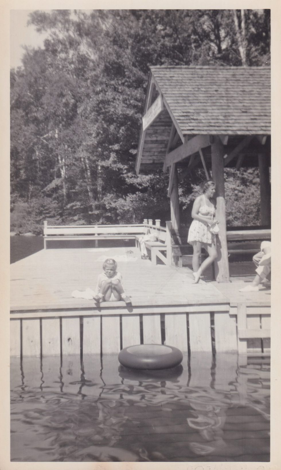 Black-and-White photograph of a child seated on the dock around the lakeside "pool" at Pyramid Camp (AKA Bartlett Carry Club). A covered walkway can be seen in the background with a sign reading, "Pyramid Camp."