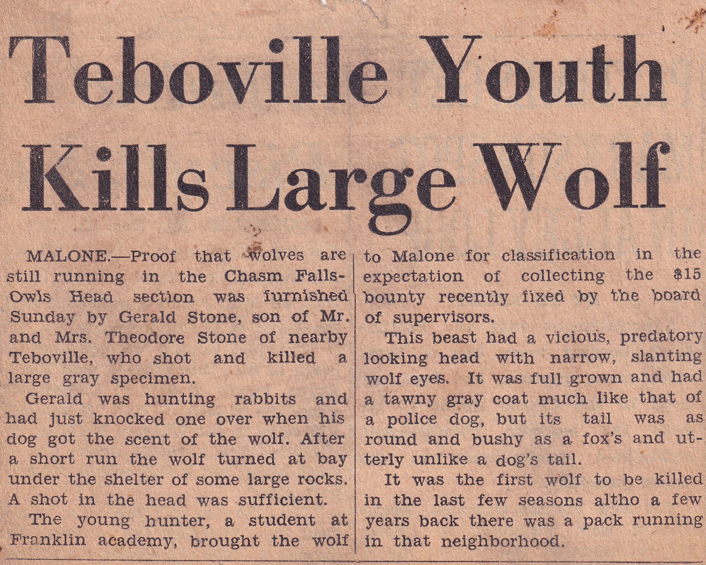 Newspaper clipping of article titled, "Teboville Youth Kills Large Wolf," from an unidentified newspaper. Article is not dated, location is Malone.
