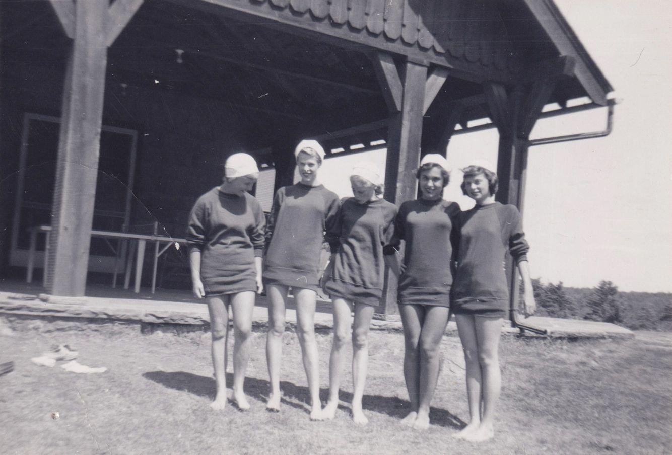 Black-and-White photograph of a group of young women standing outdoors in matching large sweatshirts and swim caps. A large unidentified building at Pyramid Camp (AKA Bartlett Carry Club) can be seen behind them. Handwritten note on reverse reads, "52."
