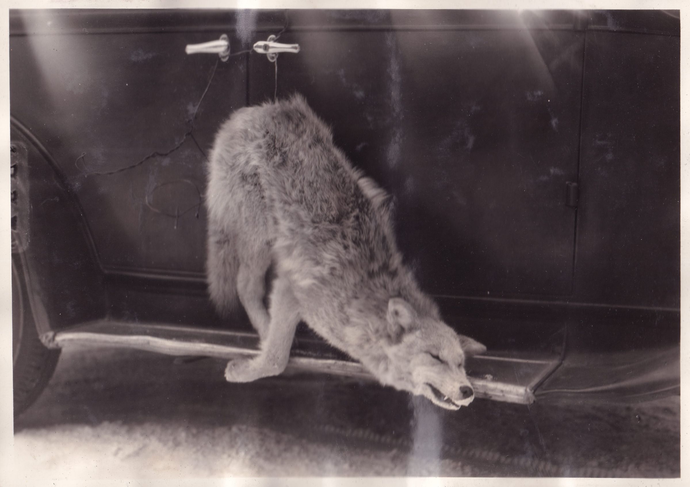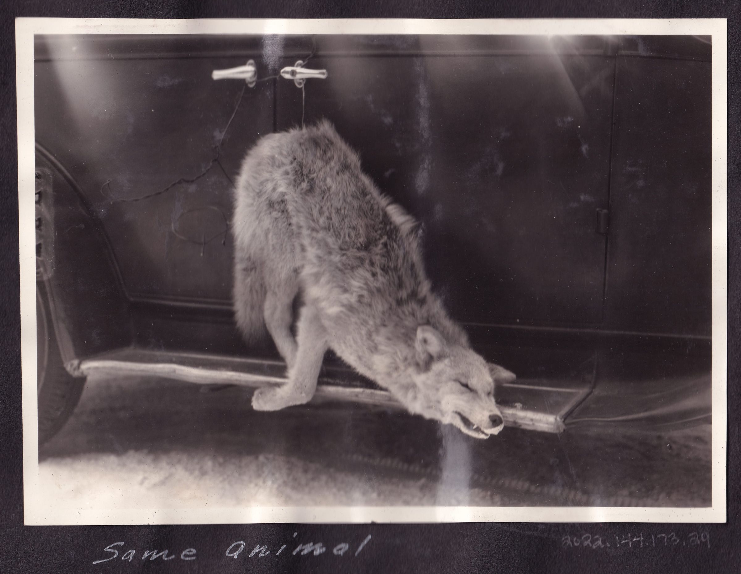 Photograph of a dead wolf leaning on the runningboard of a black car. Handwritten caption on page reads, "Same Animal." Note: Same wolf as pictured in 2022.144.173.27.