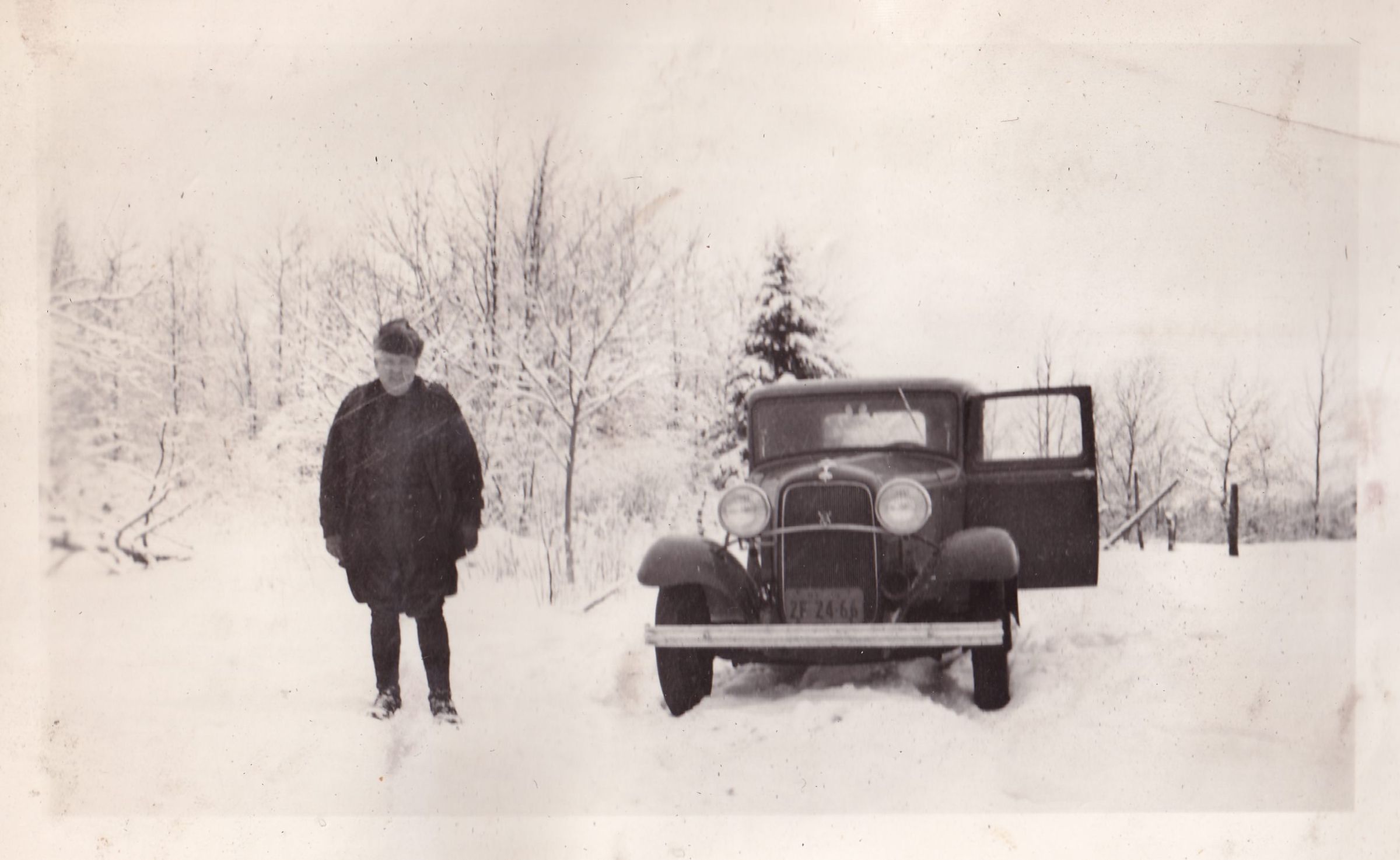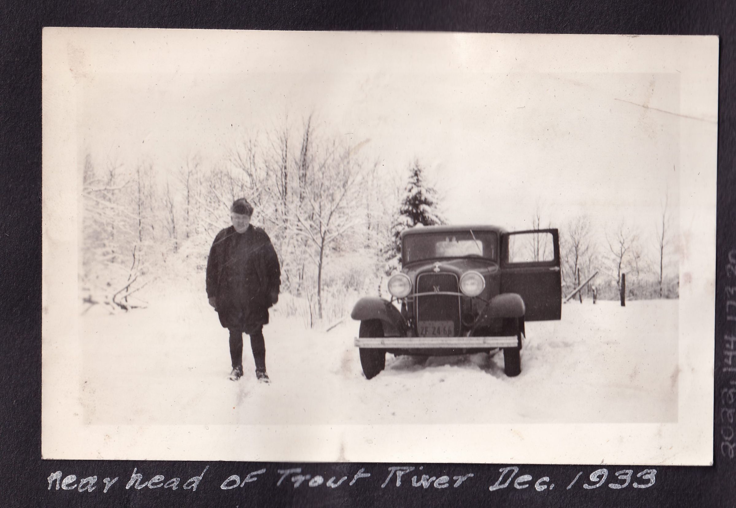 Photograph of Ray Burmaster standing in the snow next to an automobile. The driver's side door is open, and it is snowing. Handwritten caption on page reads, "Near head of Trout River, Dec. 1933."