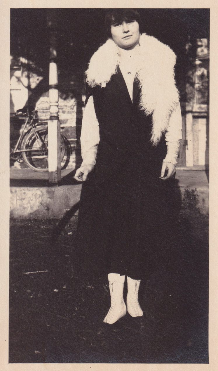 Black-and-White photograph of an unidentified woman standing in front of a house. She is wearing a fur stole draped over her shoulders. The photograph was likely printed by Kollecker's Kodak and Gift Shop.