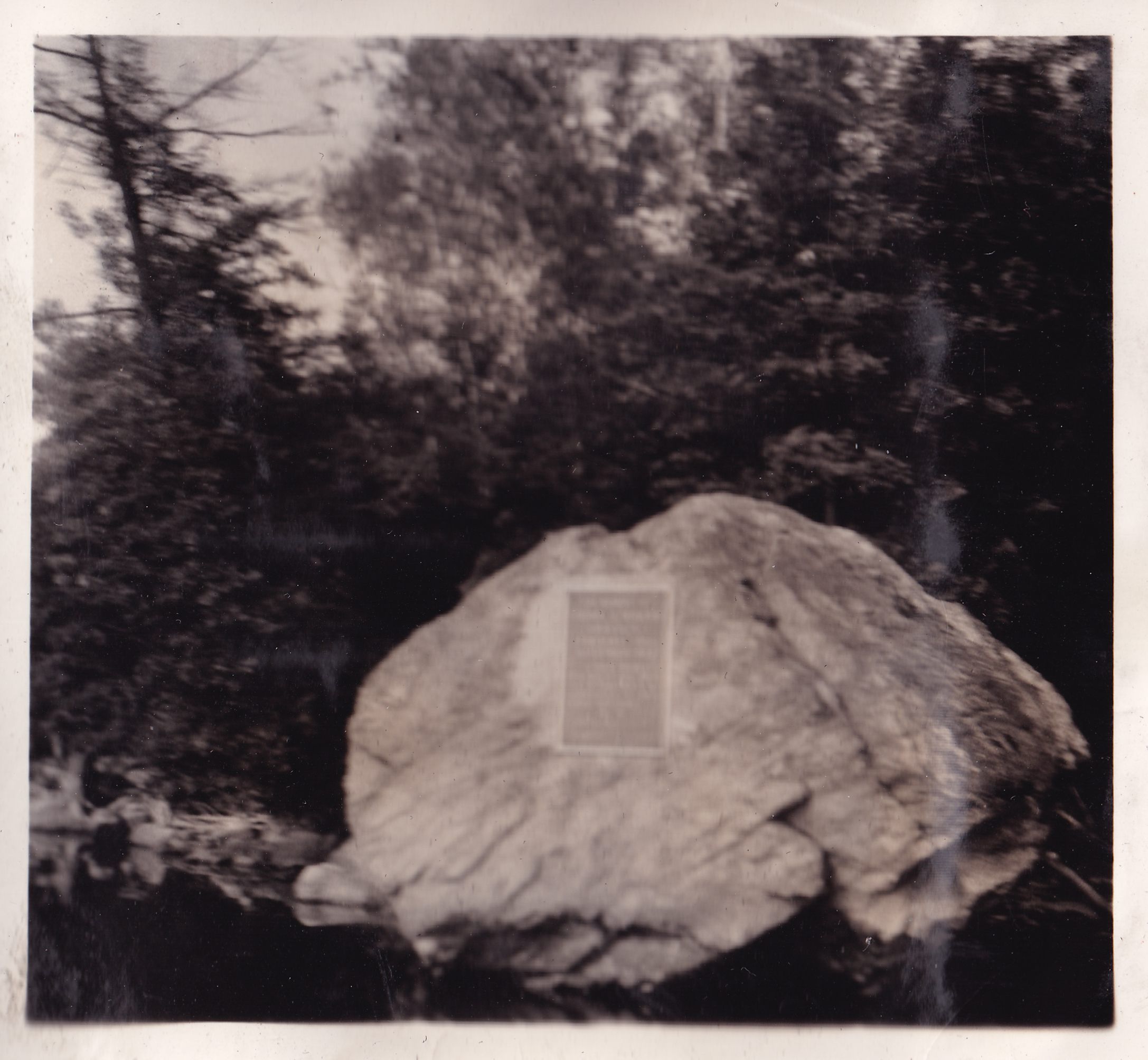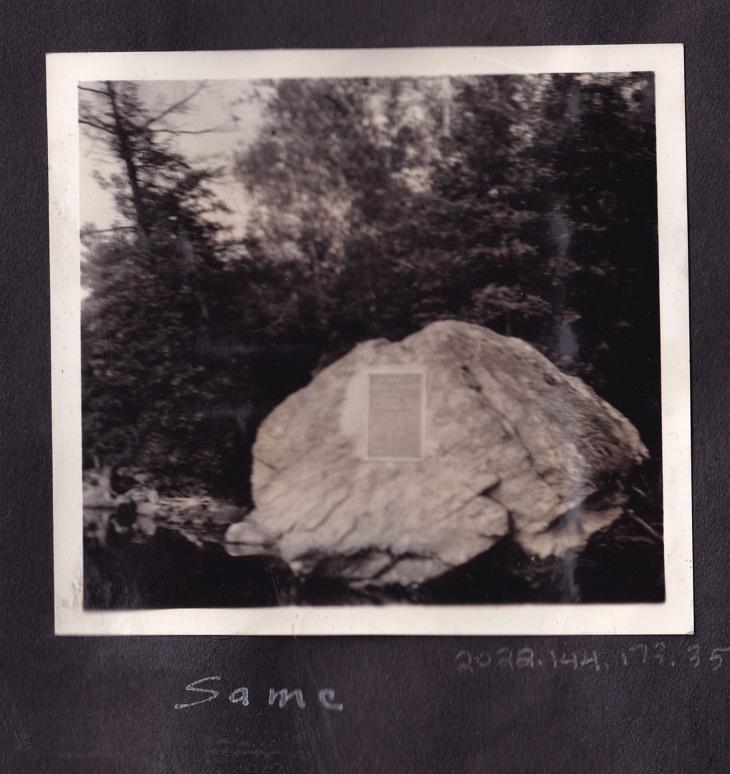Photograph of a plaque mounted on a large rock. Handwritten caption on page reads, "Same." Distance view of Cronk S. Rogers memorial plaque in 2022.144.173.34.