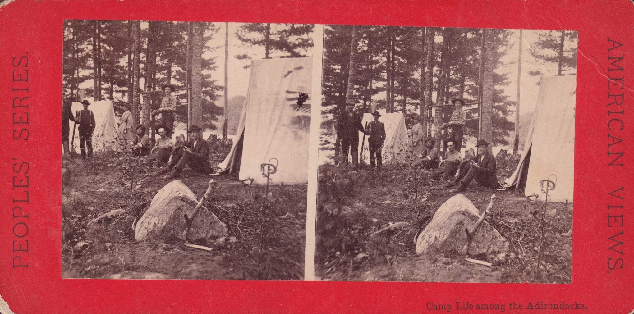 Black-and-White stereoview photograph of a group of guides/hunters at camp. Most of them are seated on the ground between two canvas tents. A woman can be seen in the background near one of the tents. Printed caption on backing reads, "Camp Life Among the Adirondacks." "Peoples' Series, American Views," is printed on the sides of the backing.Photograph Details