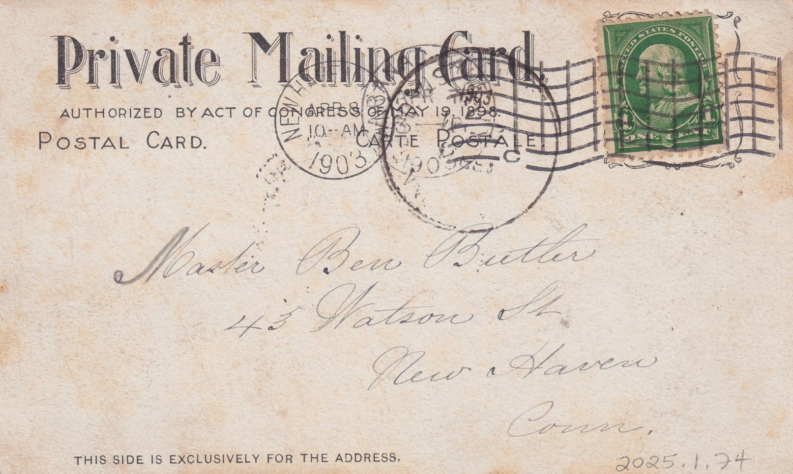 Handwritten message on front reads, "4/7/03. Well Ben, Here is a picture of boys & girls who took part in Carnival & I think if you will look at the picture, I have home, of the Ice Palace, you will find this float on it. From Yr. Aff Pop WB [?]." Mailed to Master Ben Butler, 43 Watson St., New Haven, Conn.Subject Place