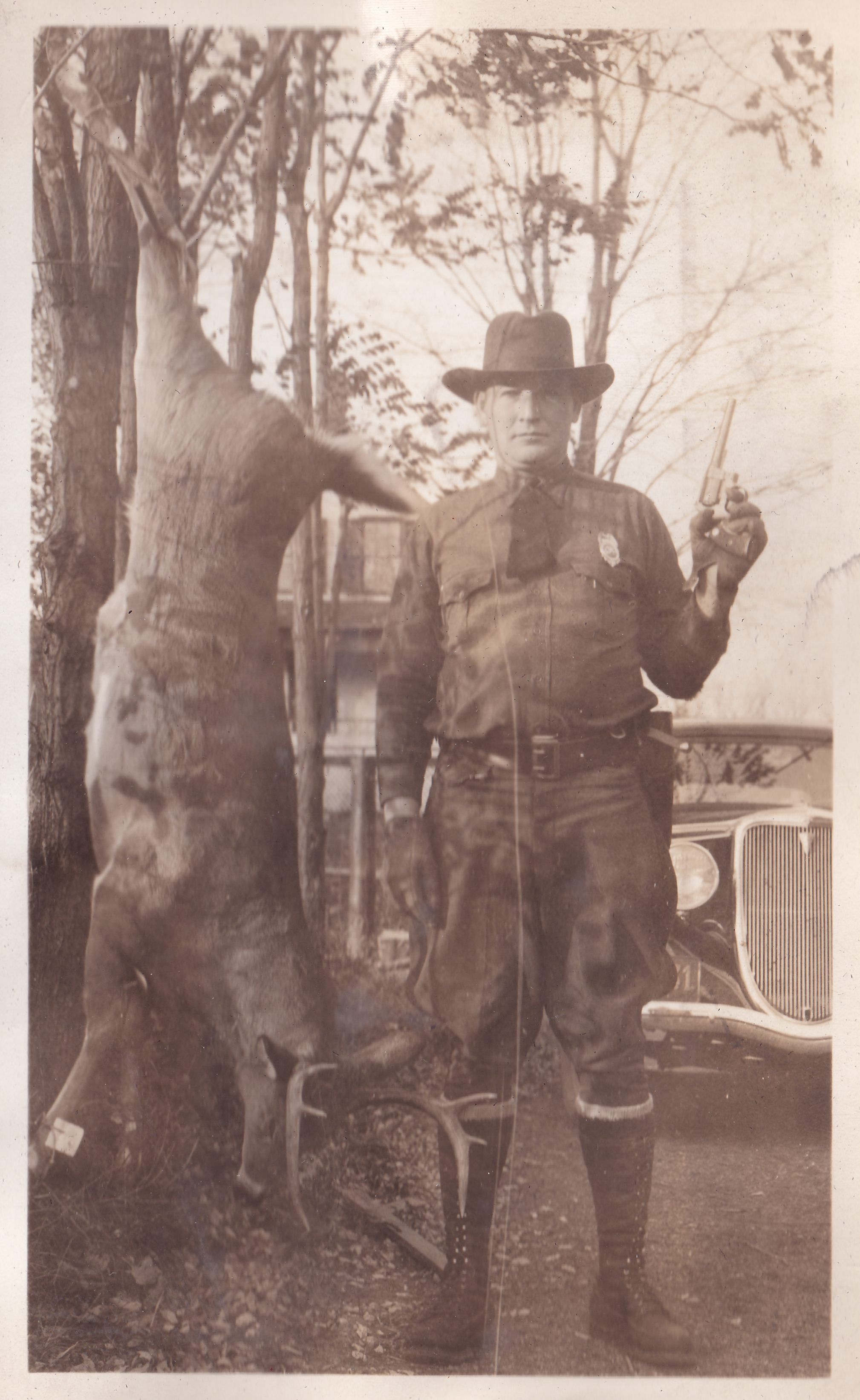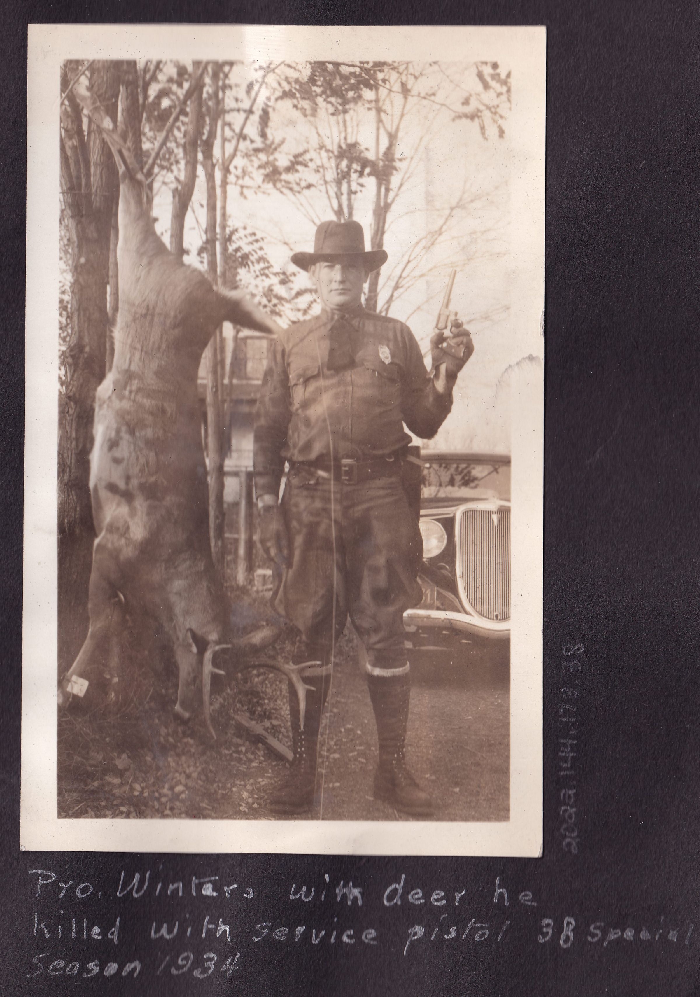 Photograph of a man in uniform standing next to a dead buck, which is hanging from a tree by its hind legs. The man is holding a pistol up in his left hand. He has a badge pinned to his chest. There is a car visible behind him. Handwritten caption on page reads, "Pro. Winters with deer he killed with service pistol, .38 special, Season 1934."Lexicon