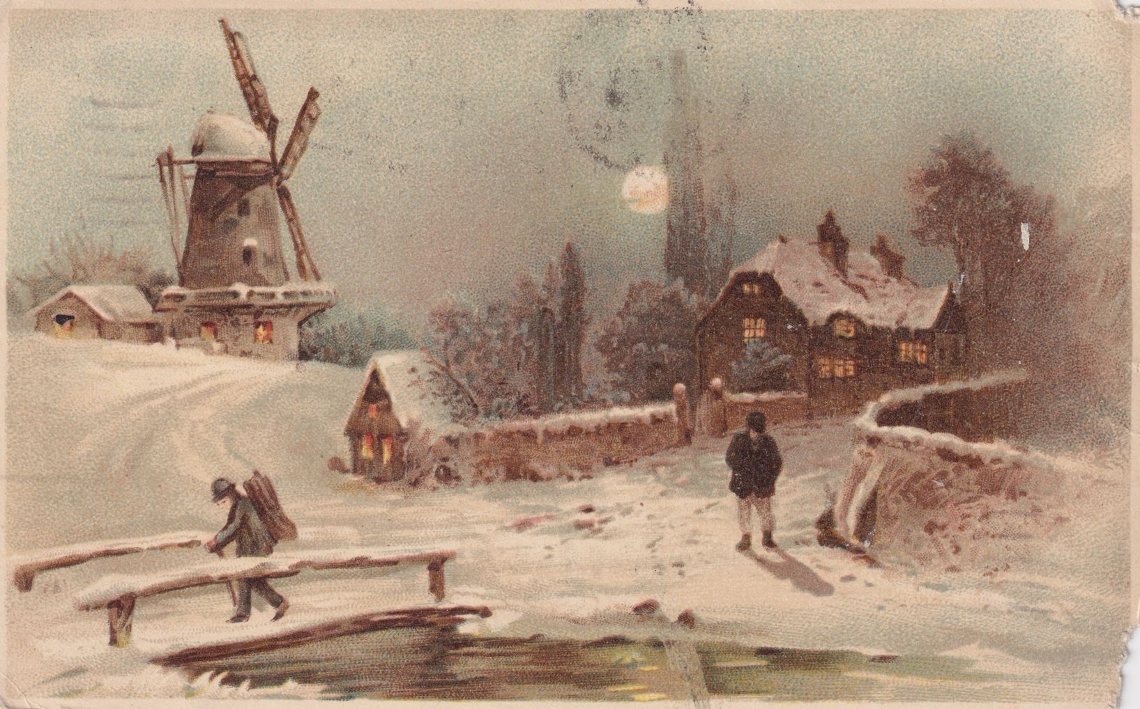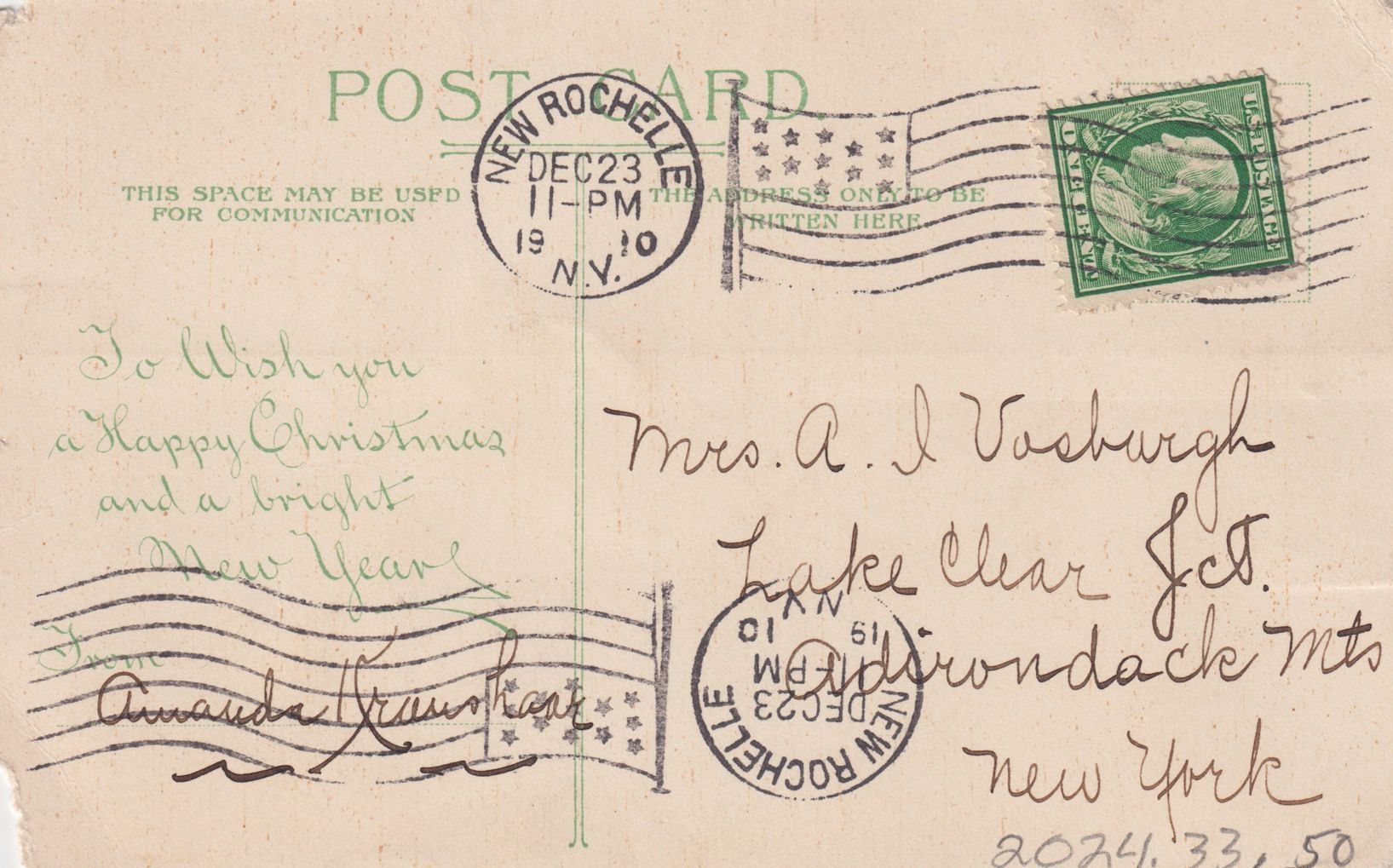Color postcard of a painting of a winter scene. The postcard is addressed to Mrs. A. I. Vosburgh of Lake Clear.