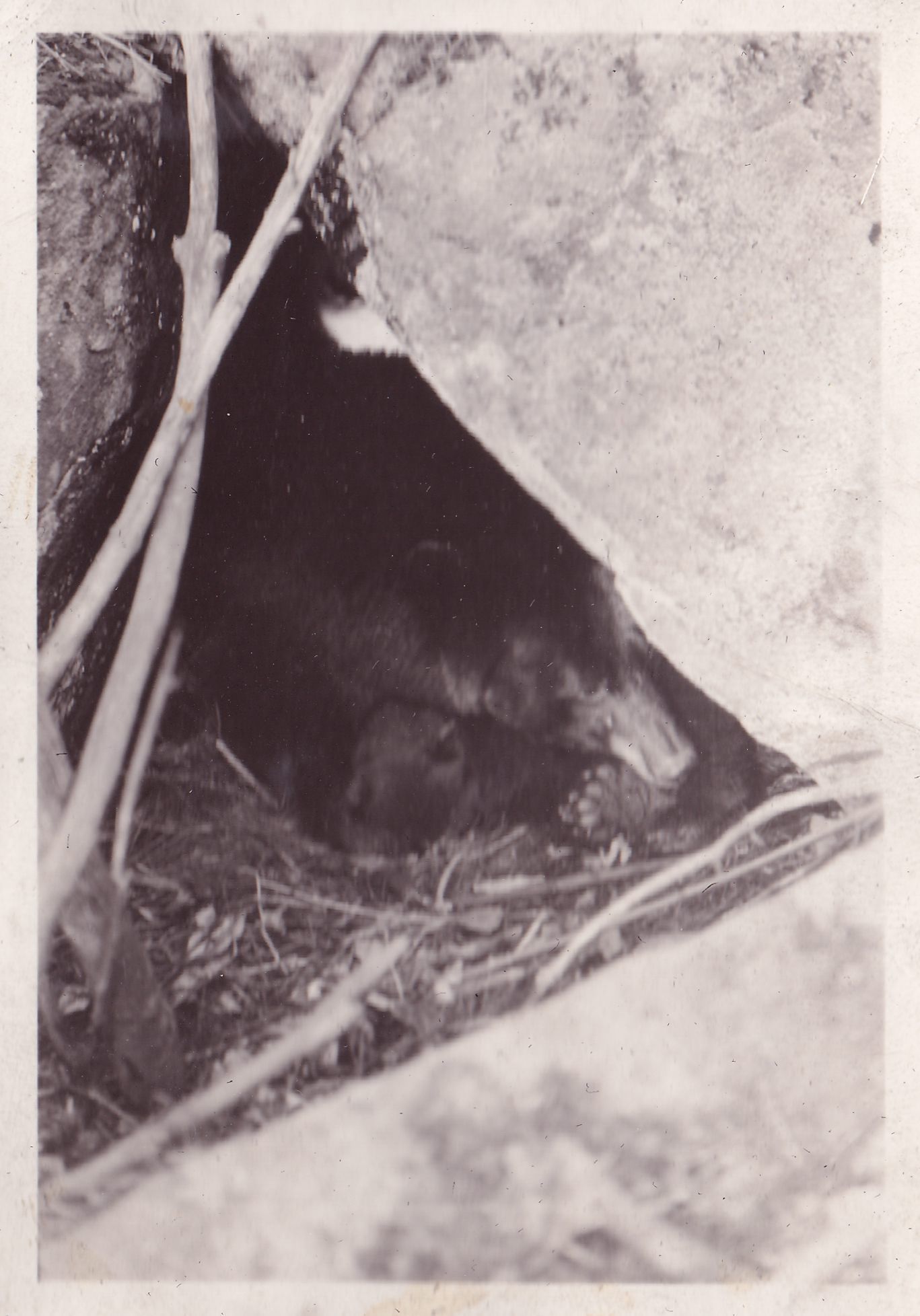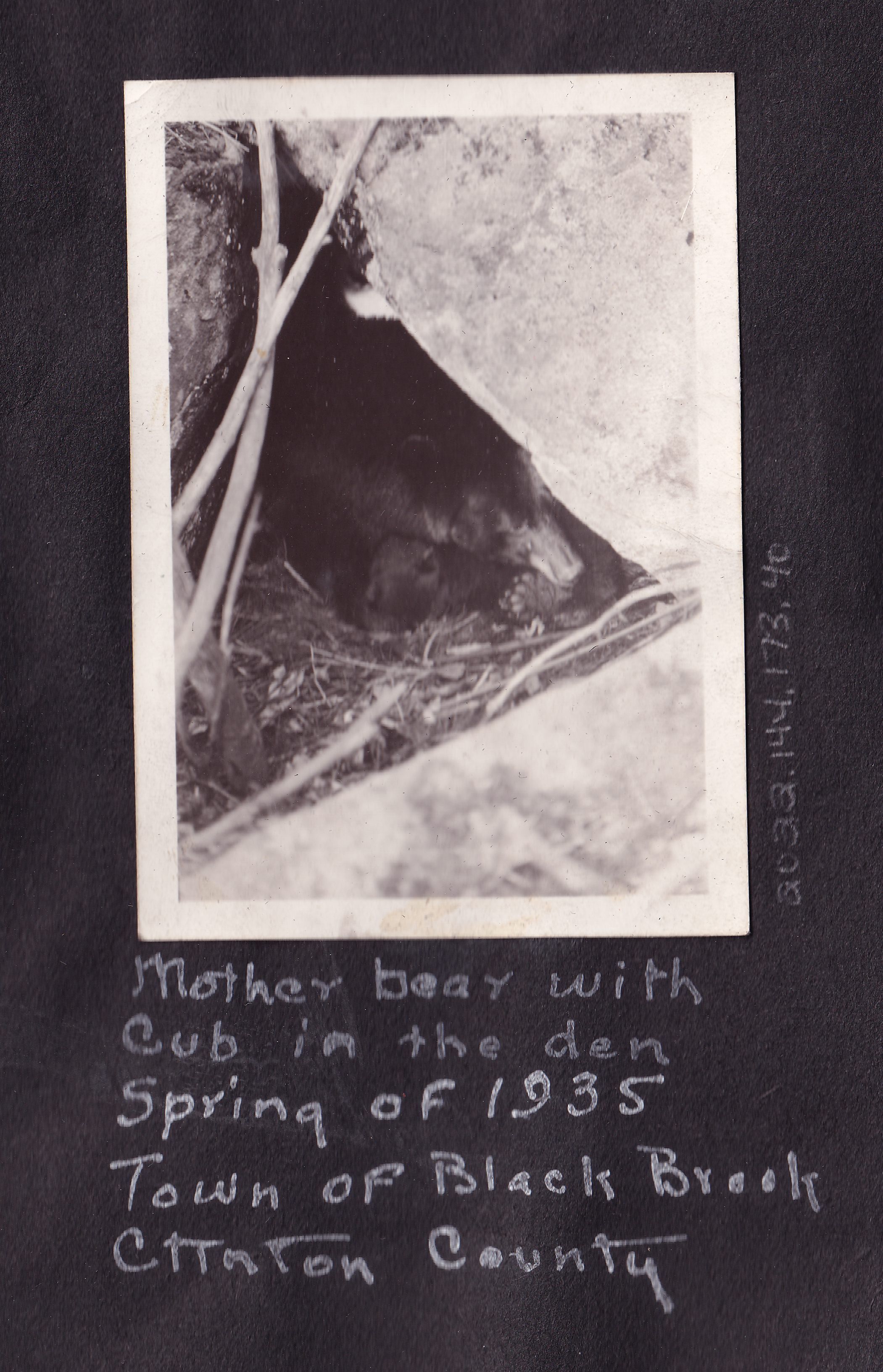 Photograph of a bear and cub in a den. Handwritten caption on page reads, "Mother bear with cub in the den. Spring of 1935. Town of Black Brook, Clinton County."