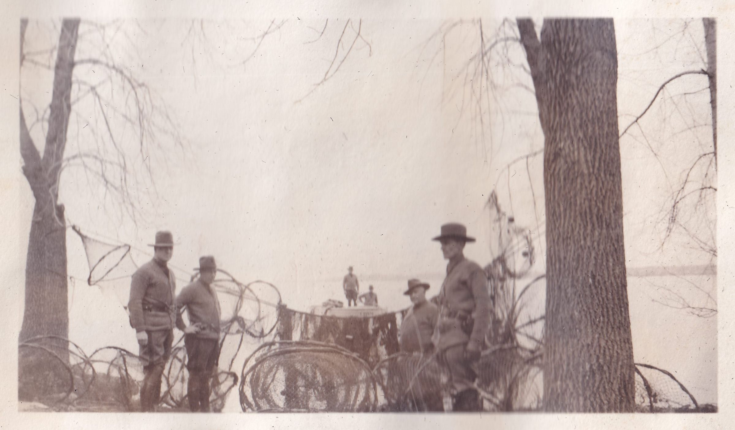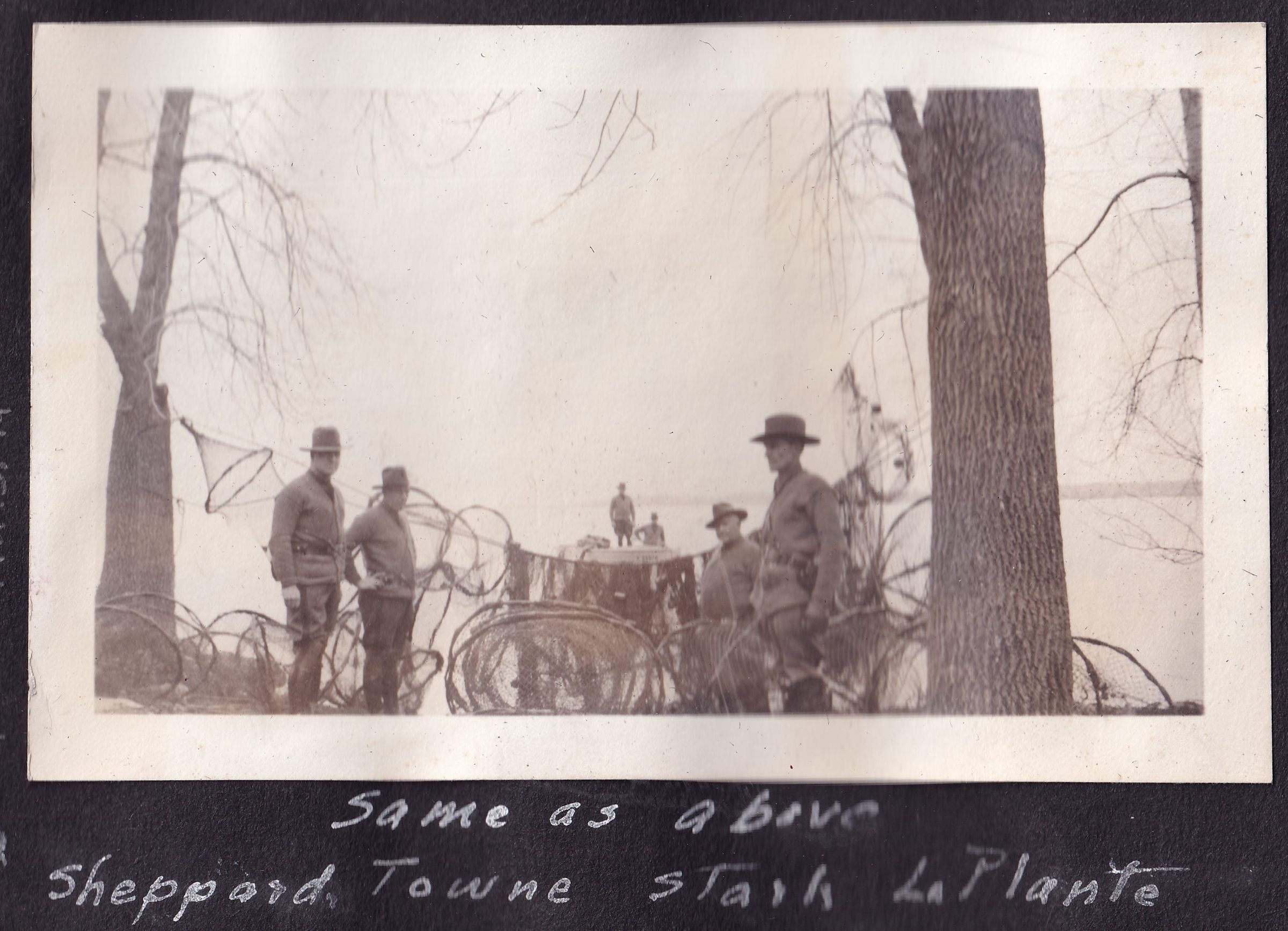 Photograph of four men in uniform standing in front of more than a dozen fishing nets. Two men can be seen in a boat on the lake behind them. Handwritten caption on page reads, "Same as above [Nets Seized in Lake Champlain 1935. Found by aid of plane.]. Sheppard, Towne, Stark, LaPlante."Lexicon