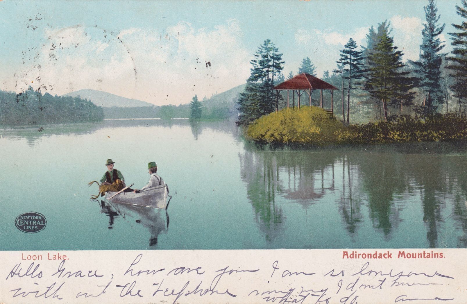 Color postcard with an image of two men in a boat on Loon Lake. The postcard is addressed to Miss Grace Taft.