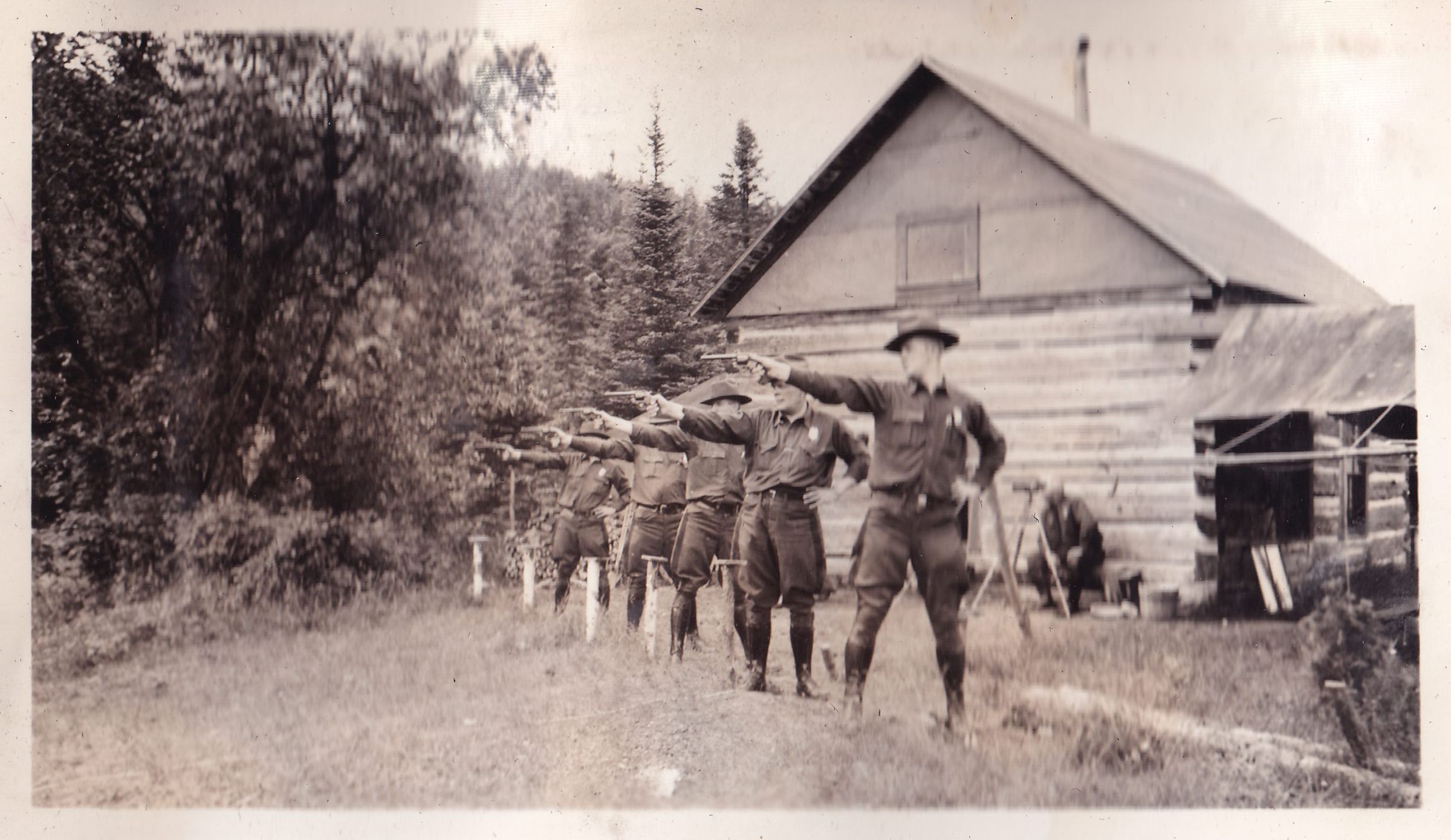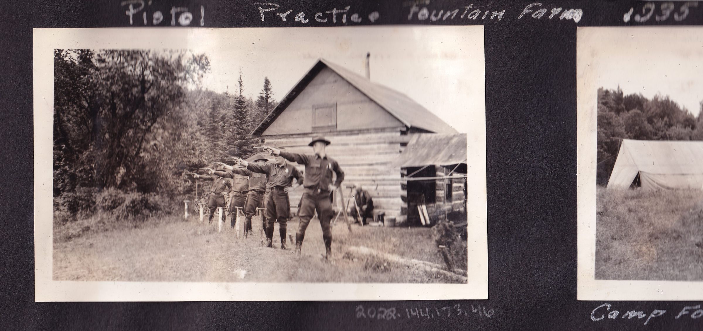 Photograph of a line of men in uniform, preparing to fire pistols. There is a log building behind them. Handwritten caption on page reads, "Pistol practice, Fountain Farm, 1935."Lexicon