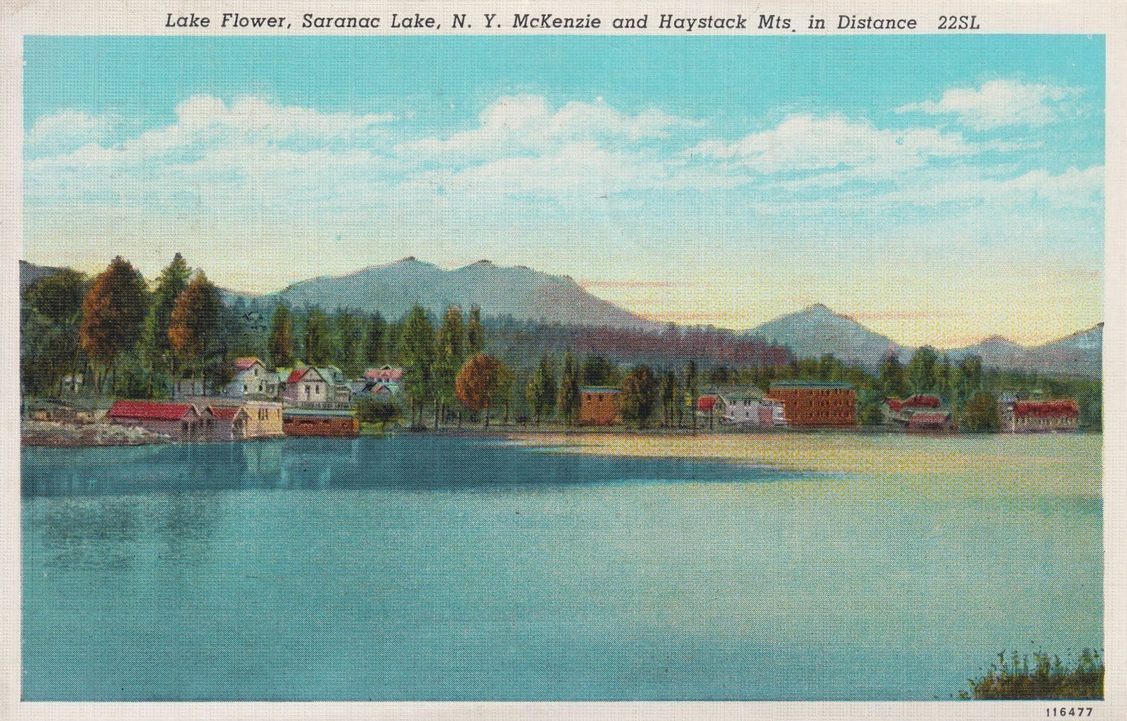 Color postcard showing the view looking east across Lake Flower toward Helen Hill. Printed caption on front reads, "Lake Flower, Saranac Lake, N. Y. McKenzie and Haystack Mts. in Distance" Printed by C. W. Hughes & Co., Mechanicville, NY. Used, divided back, white border, linen texture, postmarked Saranac Lake, November 23, 1940.