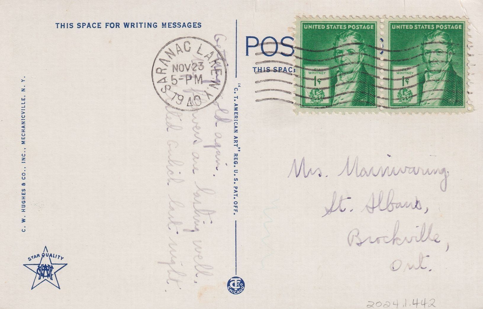 Handwritten message on reverse reads, "Getting cold again. My flowers are lasting well. Visited Gulich last night." Mailed to Mrs. Mainwaring, St. Albans, Brockville, Ont.Subject Place