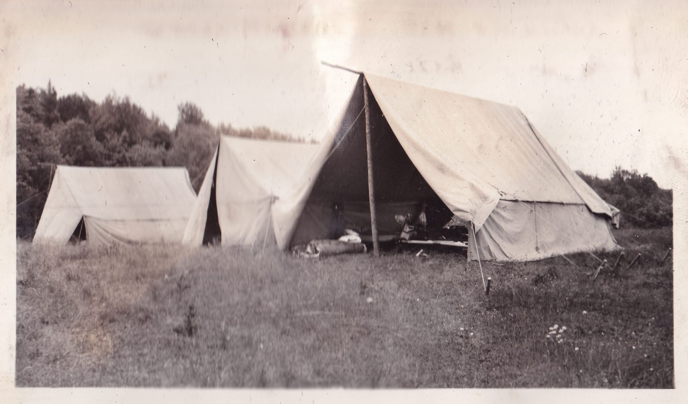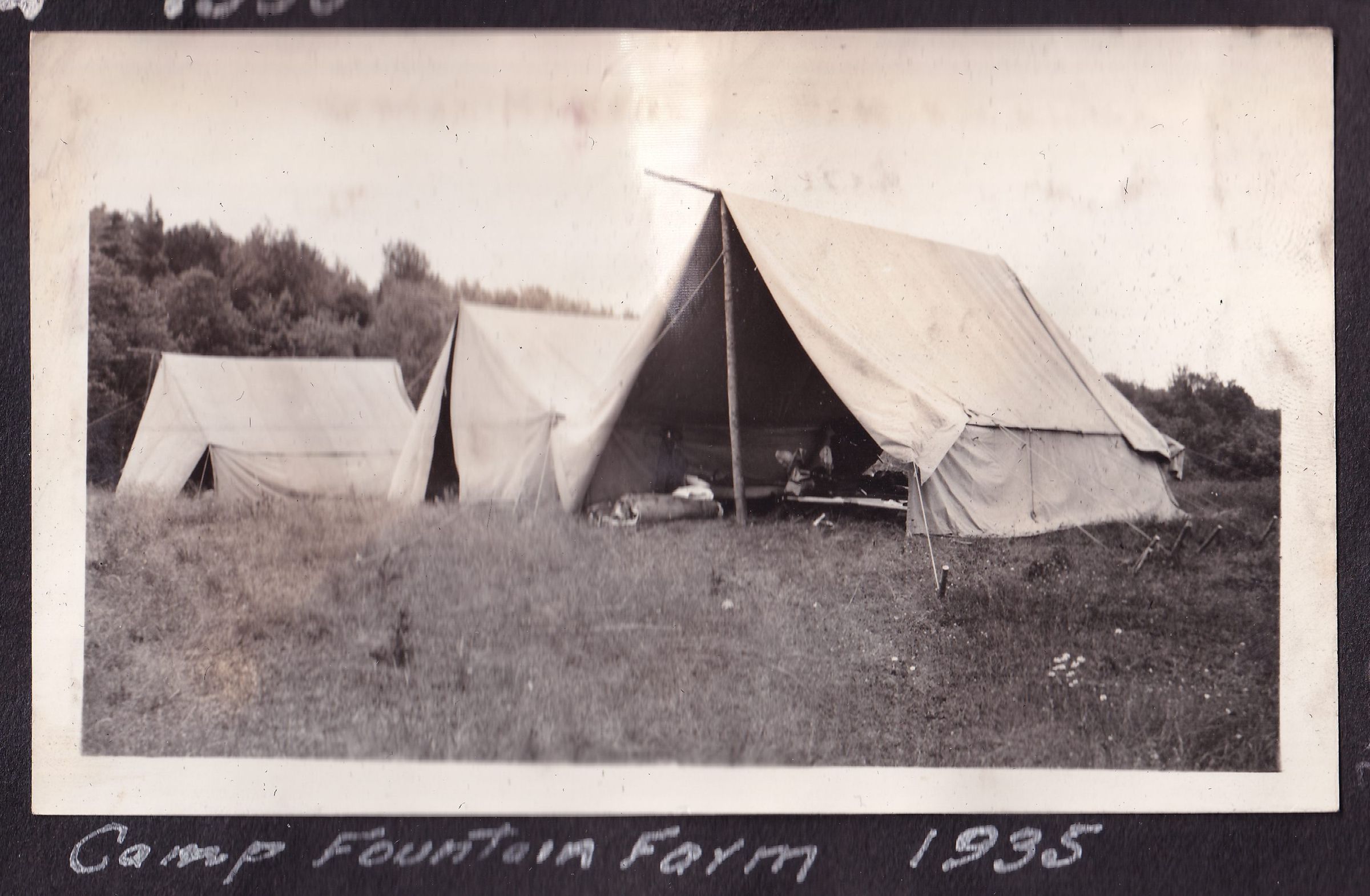Photograph of three canvas tents in a field. The tent in the foreground is open and cots are visible. Handwritten caption on page reads, "Camp Fountain Farm. 1935."