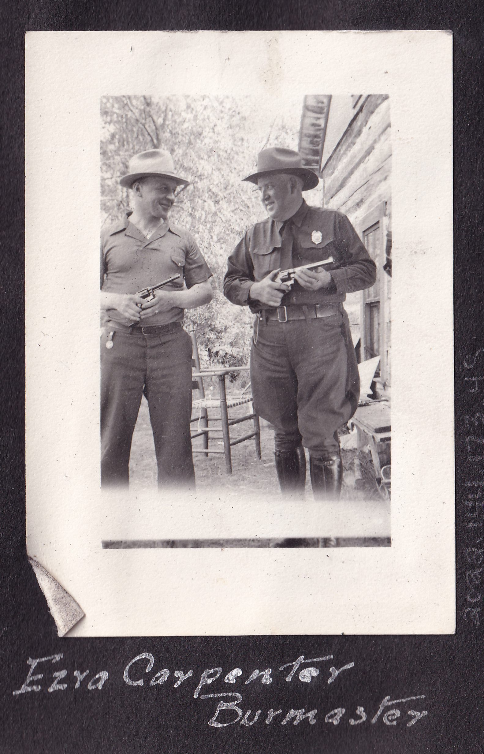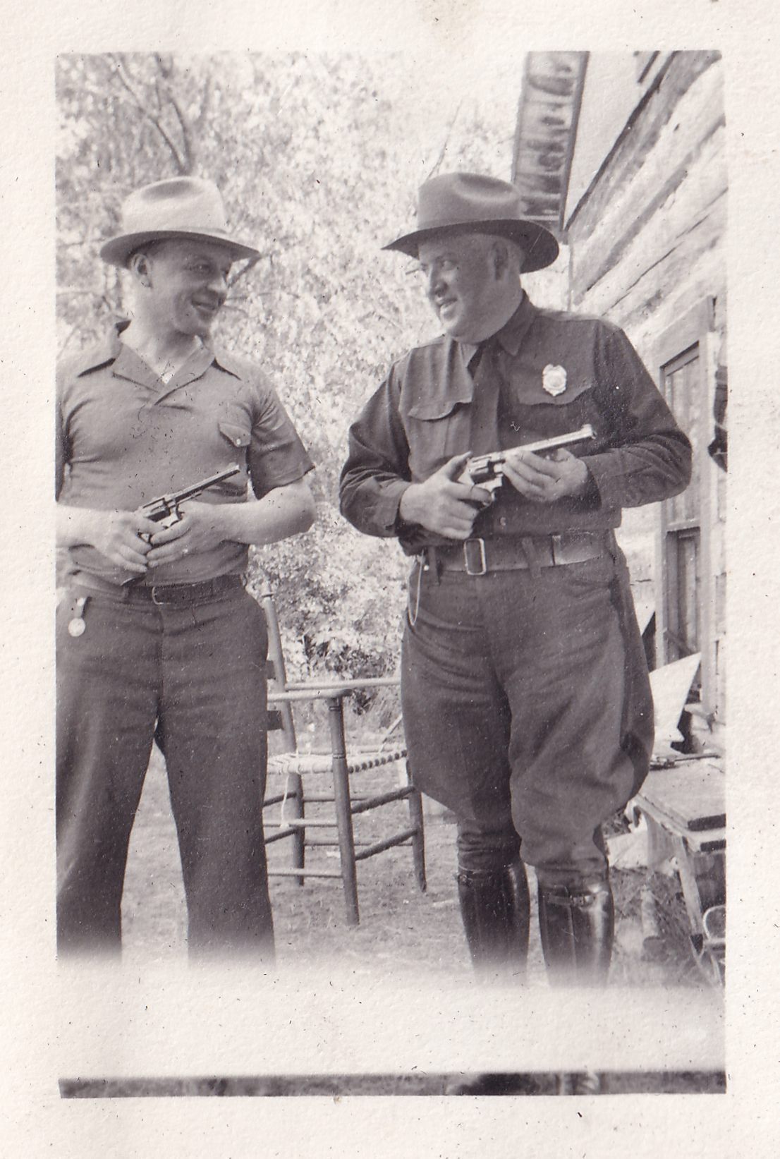 Photograph of two men holding pistols. The man at right, Ray Burmaster, is wearing a uniform with a badge pinned to his chest. Handwritten caption on page reads, "Ezra Carpenter, Burmaster."Photograph Details