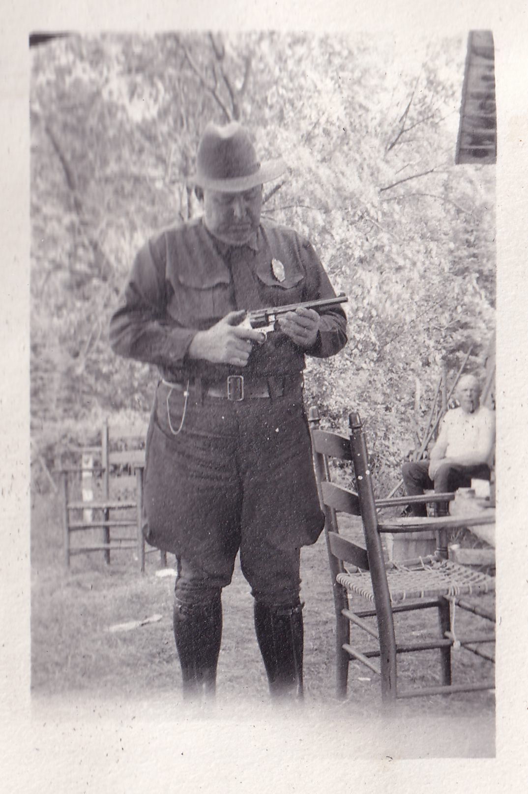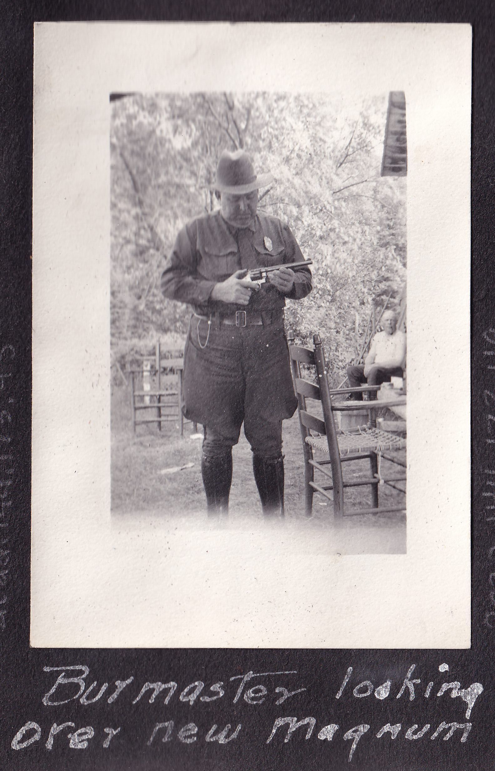 Photograph of a man in uniform looking at a pistol. He is wearing a badge on his chest. Handwritten caption on page reads, "Burmaster looking over new Magnum."