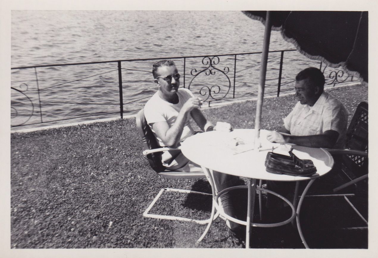 Black-and-White photograph of two unidentified men sitting at a patio table along a body of water, probably at Gauthier's Motel on Lake Flower. Print has decorative scalloped edge.