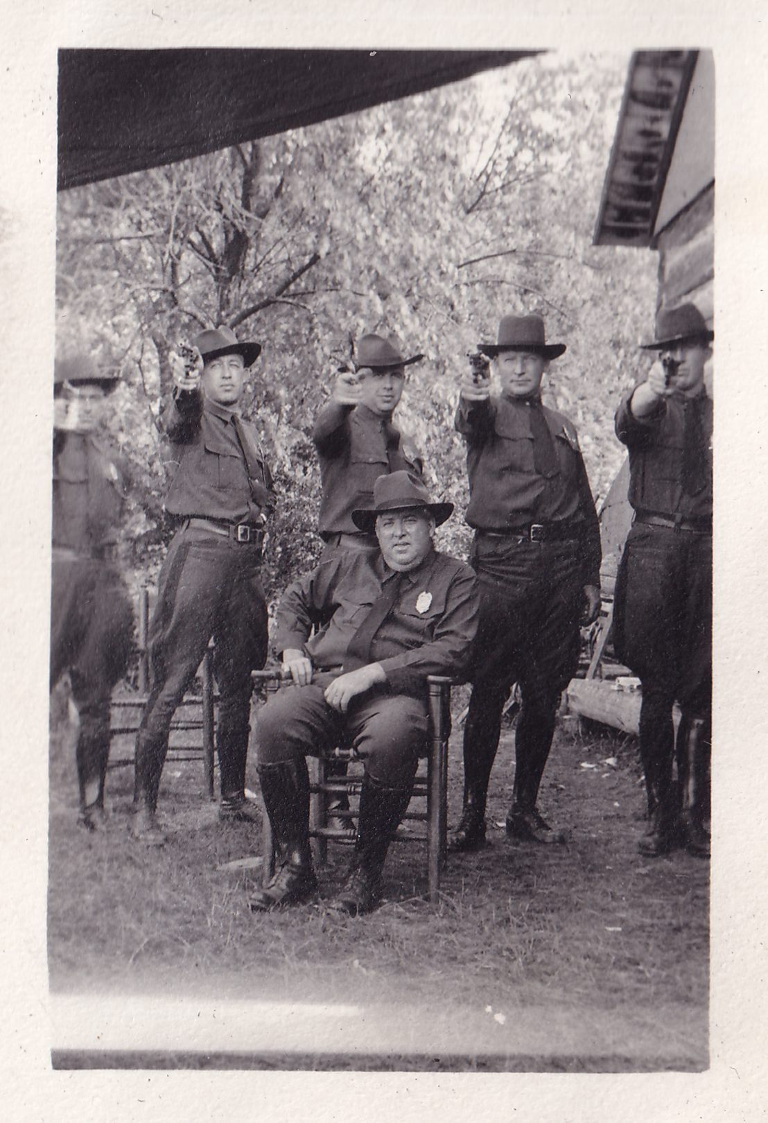 Photograph of a group of men in uniform pointing positols at the camera. Ray Burmaster is seated in a chair in front of the group. Handwritten caption on page reads, "Myers, DeRoos, Ham, Winter, Cone. Burmaster."Photograph Details