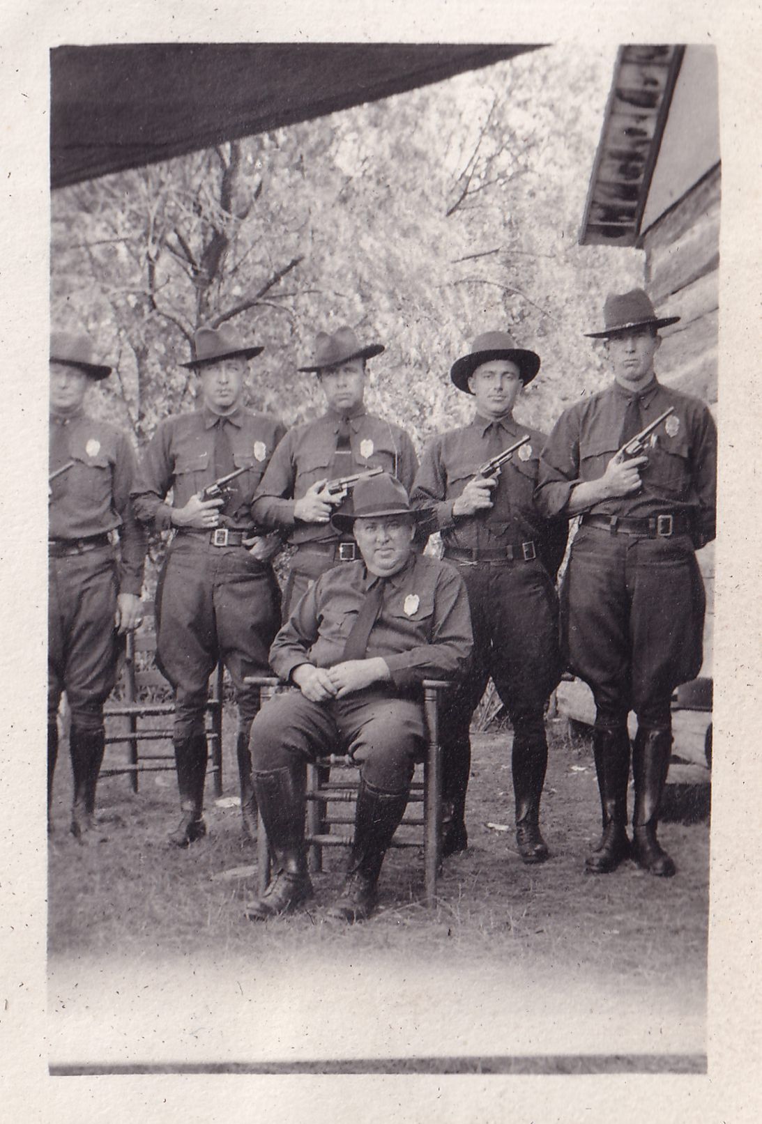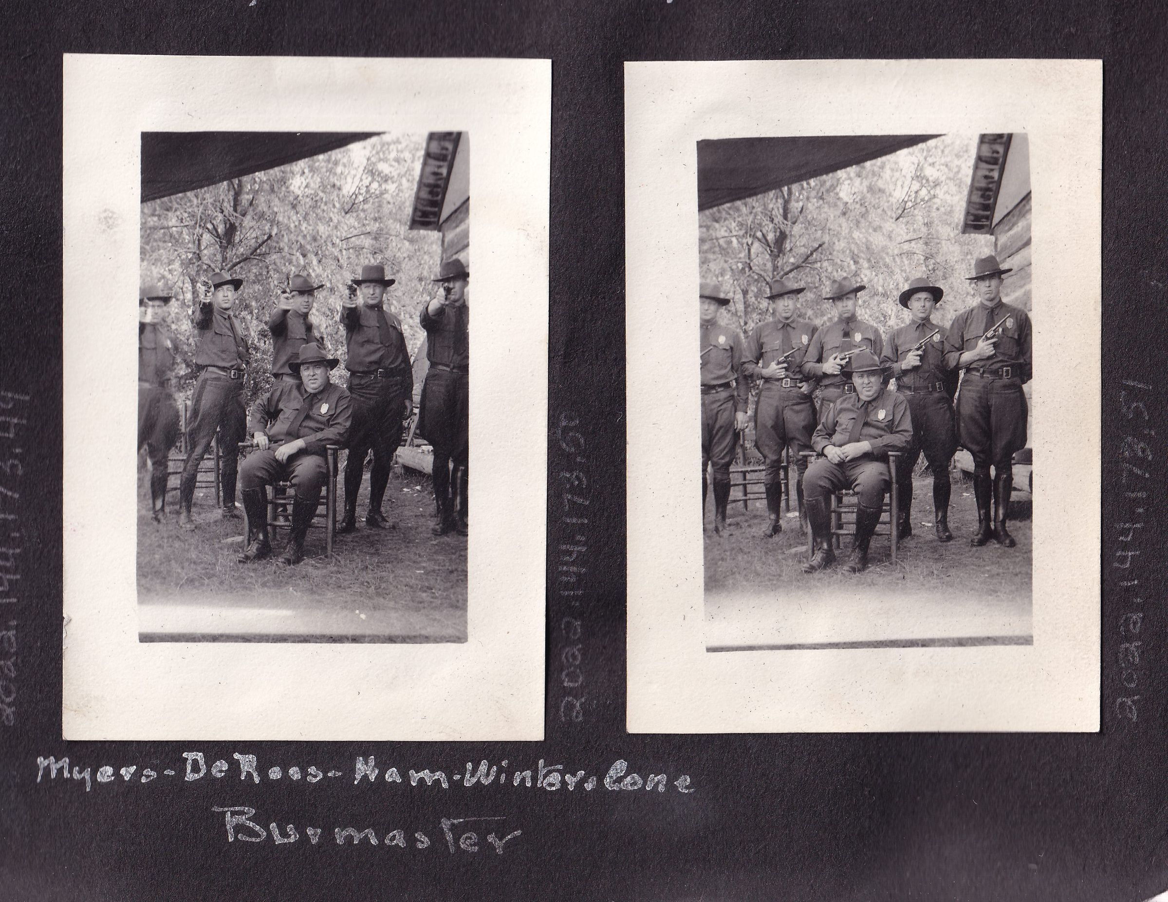 Photograph of a group of men in uniform posing with pistols in their right hands. Ray Burmaster is seated in a chair in front of the group. Handwritten caption on page reads, "Myers, DeRoos, Ham, Winter, Cone. Burmaster."Photograph Details