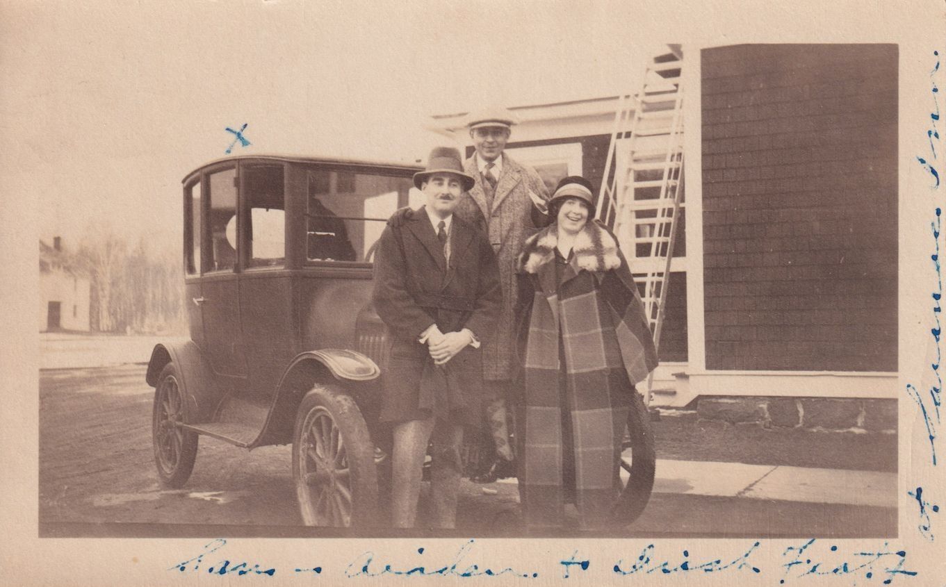 Black and white photograph of two men and one woman standing by a car. The car is parked to the right of a house or similar building. There is handwriting in blue ink around the bottom and right edges of the photograph.