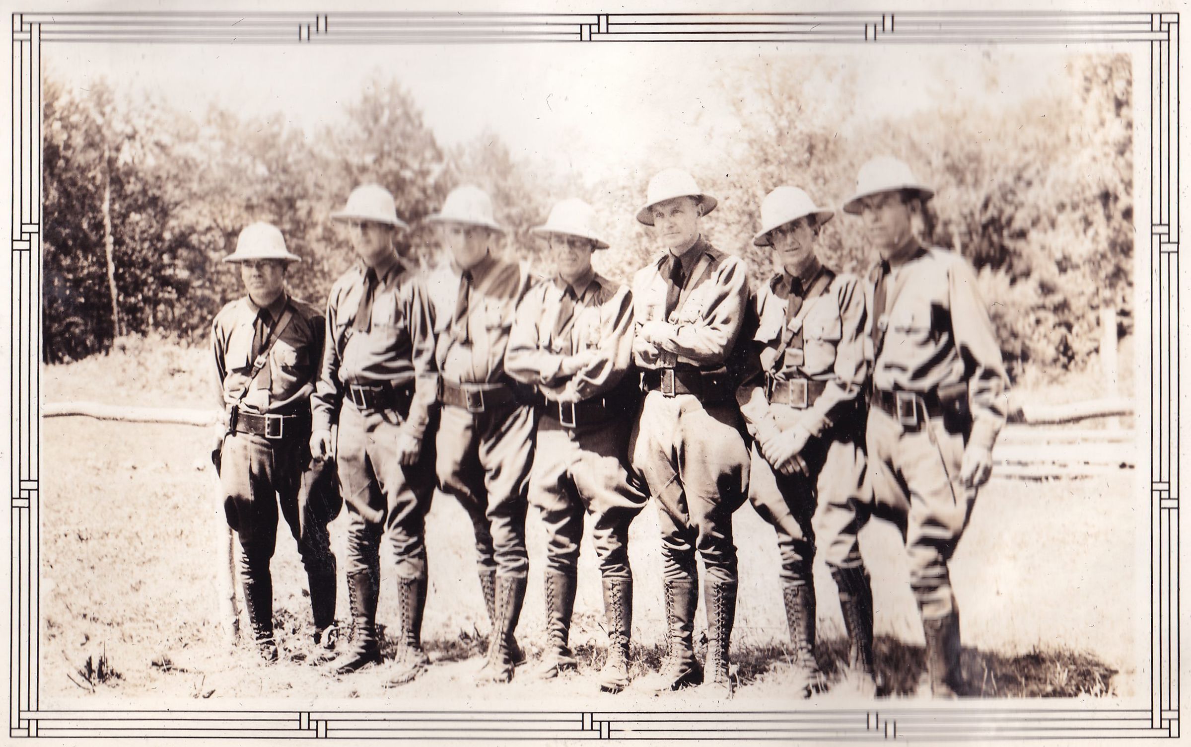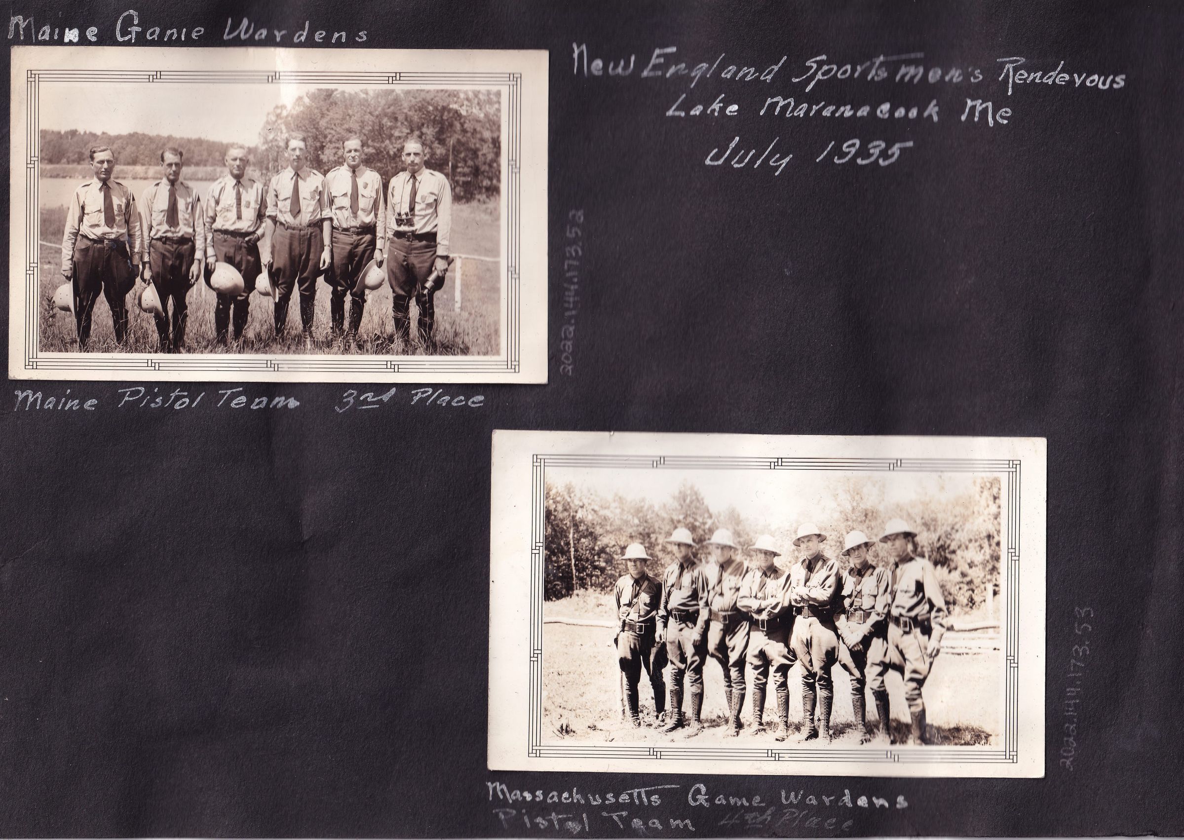 Photograph of a group of men in uniform standing in a field. Handwritten caption on page reads, "New England Sportsmen's Rendevous [sic] Lake Maranacook, ME, July 1935. Massachusetts Game Wardens. Pistol Team. 4th Place." Photograph has a decorative printed border.Lexicon