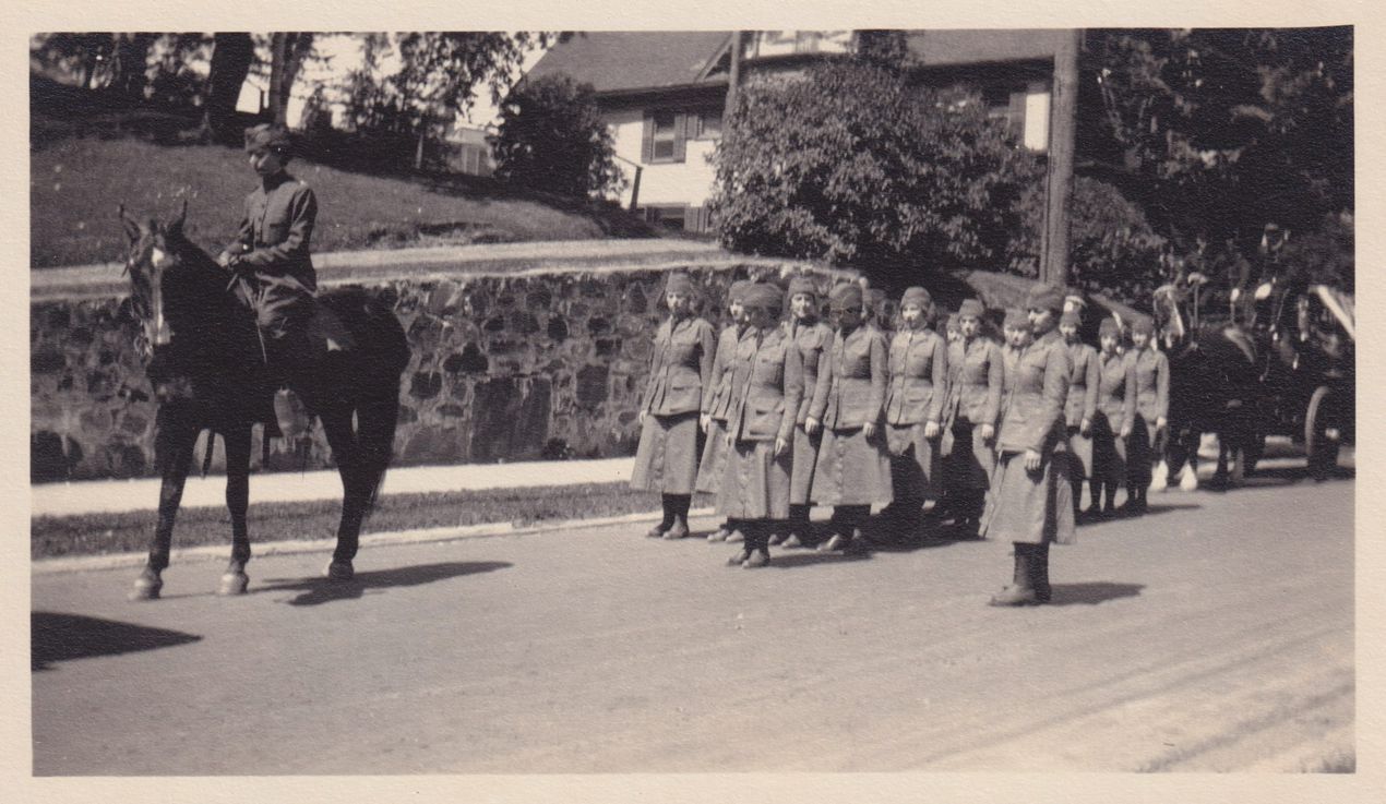 Black-and-White photograph of a group of women in uniform parading down an unidentified street. They are being led by a person in uniform on horseback. There is a stone wall and a house visible behind them. The photograph was likely printed by Kollecker's Kodak and Gift Shop.