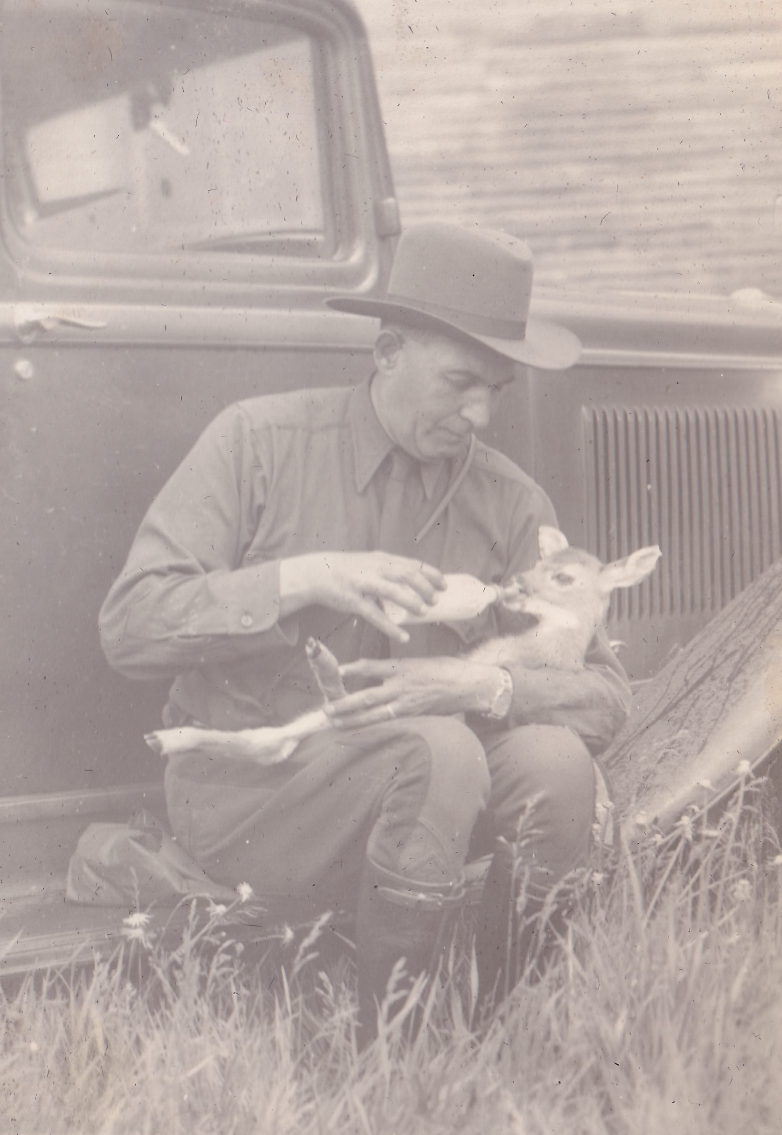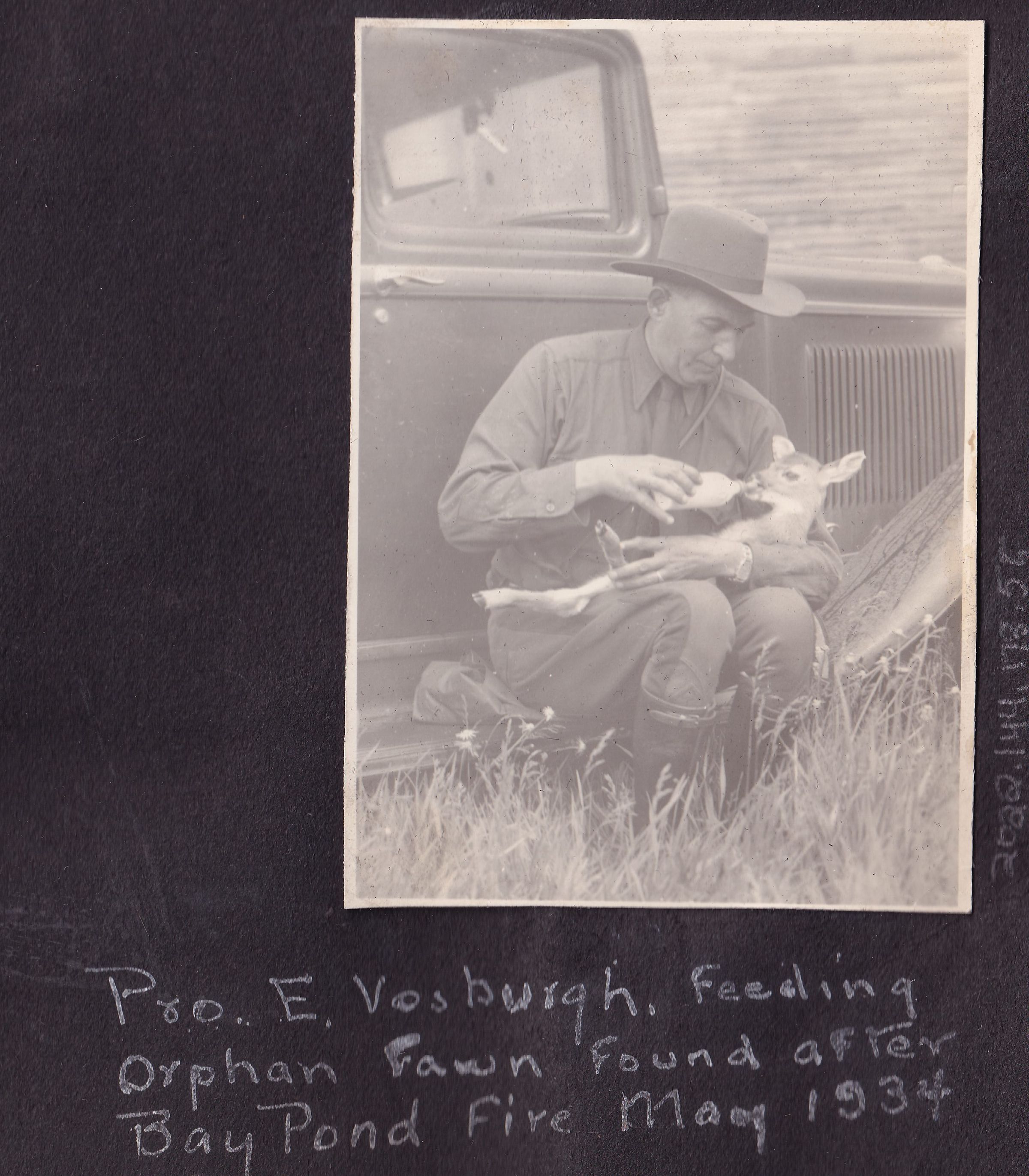 Pro. E. Vosburgh, feeding orphan fawn found after Bay Pond Fire.Entry/Object ID