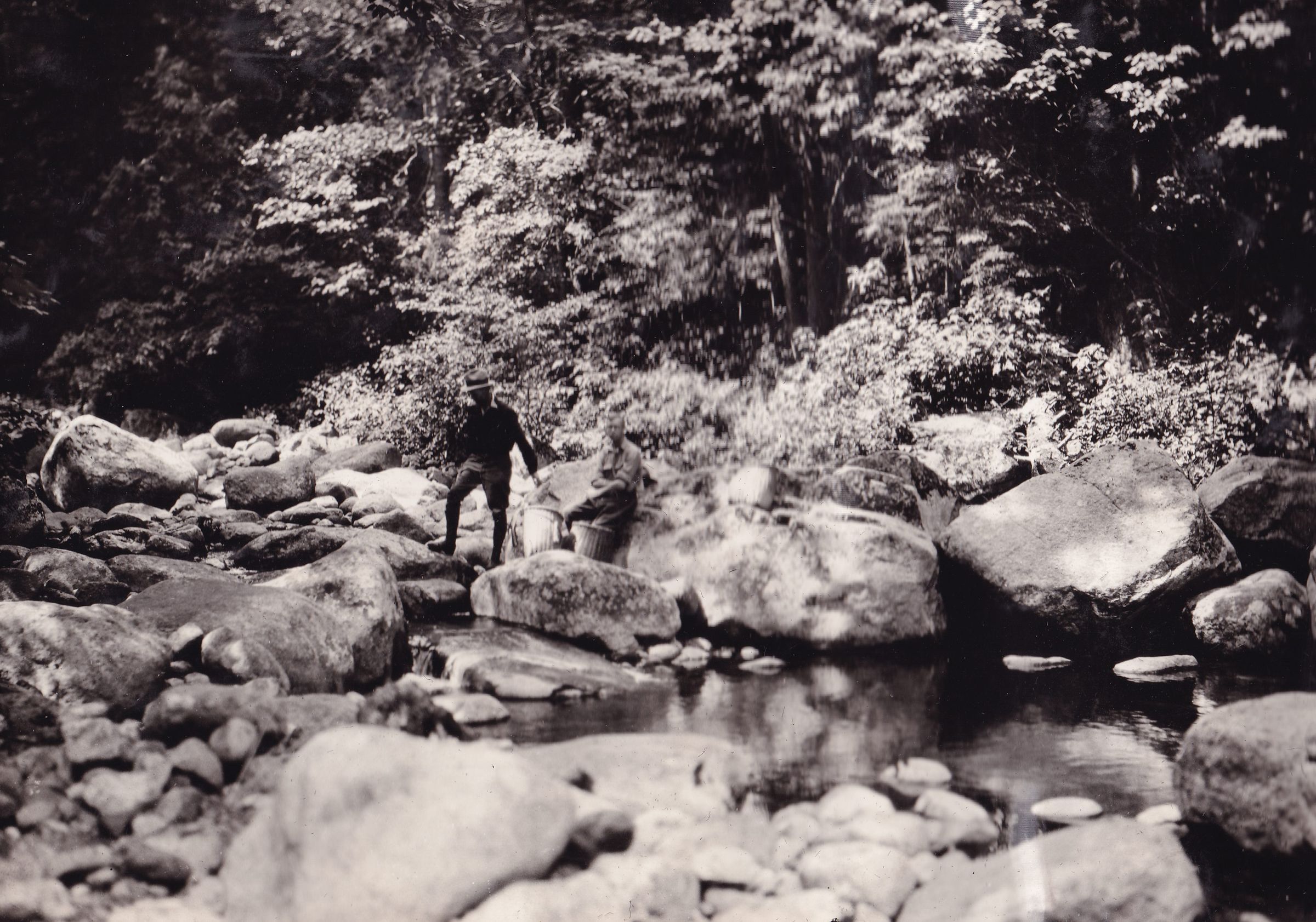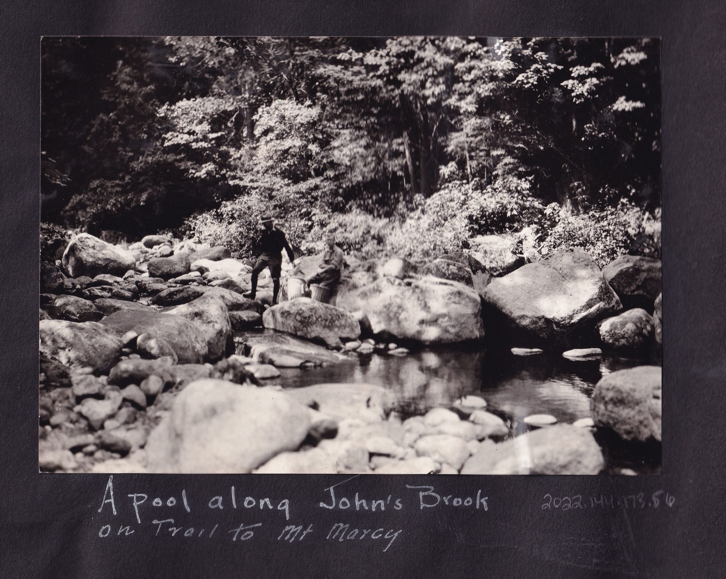 Photograph of two men on large rocks in a stream. Handwritten caption on page reads, "A pool along John's Brook on Trail to Mt. Marcy."