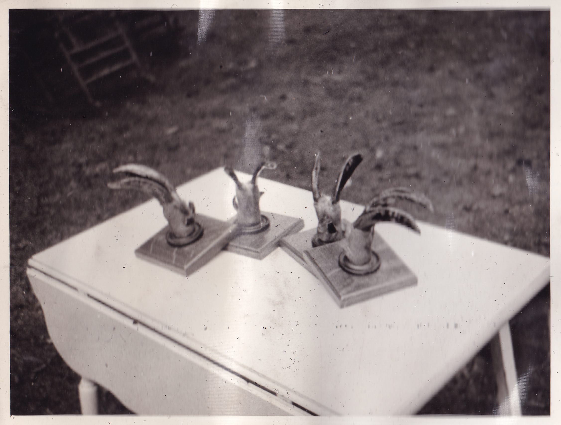 Photograph of four taxidermied deer feet with unsually long hooves. The feet are mounted on wooden squares. Handwritten caption on page reads, "Freak deer feet, deer found by R. Stevens, Rio, Orange Co., N.Y."Made/Created