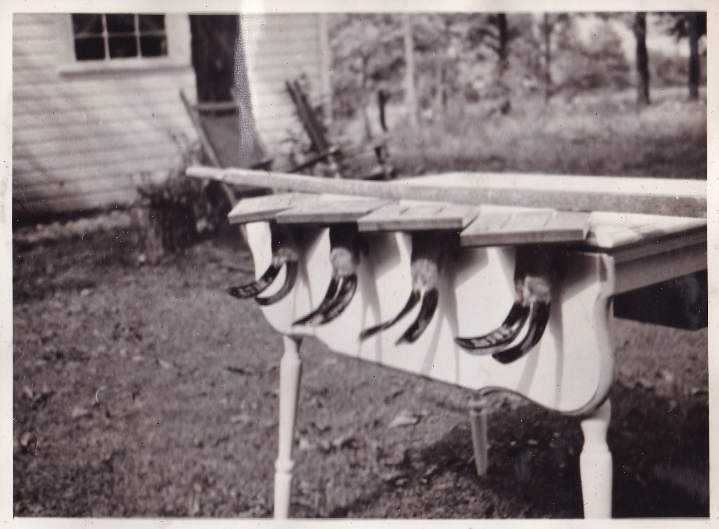 Photograph of four taxidermied deer feet with unsually long hooves. The feet are mounted on wooden squares, flipped over for the photograph. Handwritten caption on page reads, "Freak deer feet, deer found by R. Stevens, Rio, Orange Co., N.Y."Made/Created