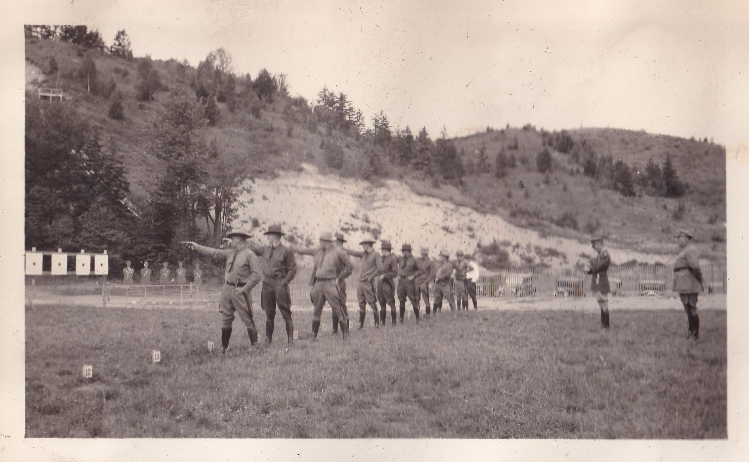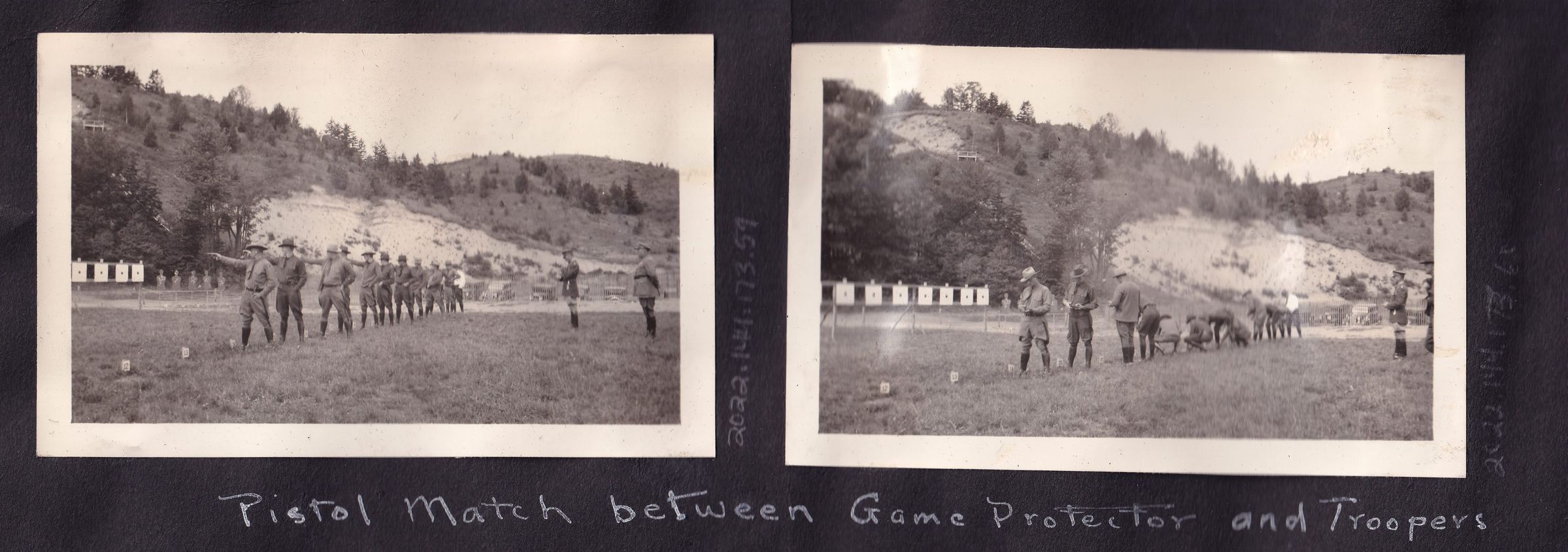 Photograph of a group of men in uniform lined up to shoot pistols. Targets can be seen in the distance. Handwritten caption on page reads, "Pistol Match between Game Protector and Troopers. 50th Anniversary, Lake Placid, September 12th, 1935. Match won by Troopers."Lexicon