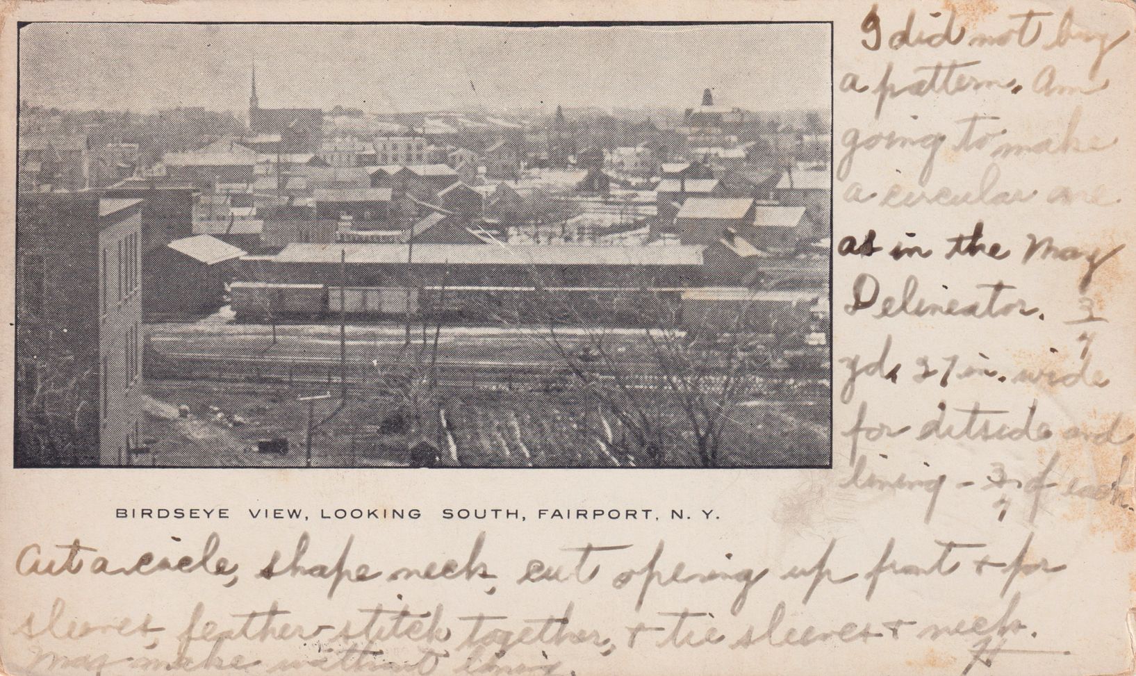 Black-and-White postcard showing an elevated view of a city. Printed caption on front reads, "Birdseye View, Looking South, Fairport, N. Y." Printed by Mail Printing House, Fairport, N. Y. Used, undivided back, white space on front for message, postmarked Perry, NY, June 7, 1906.