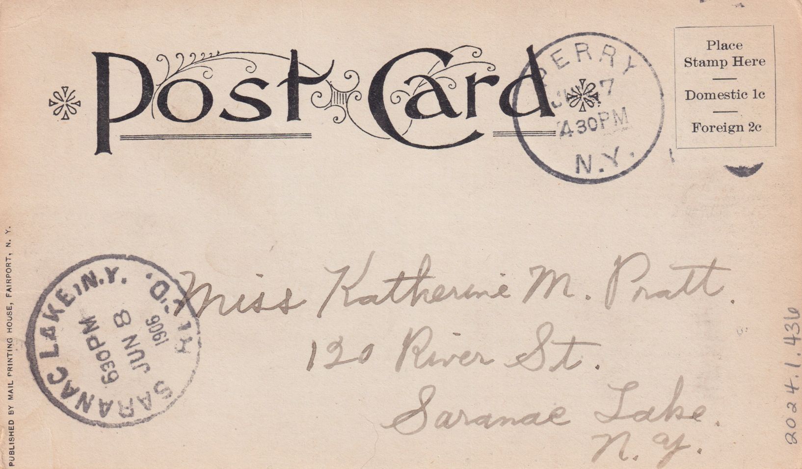 Handwritten message on front reads, "I did not buy a pattern. Am going to make a circular one as in the May Delineator. 3/4 yards 27in wide for outside and lining - 3/4 of each. Cut a circle, shape neck, cut opening up front for sleeves, feather stitch together, + tie sleeves + neck. May make without lining. H." Mailed to Miss Katherine M. Pratt, 120 River Street, Saranac Lake, NY.Collection