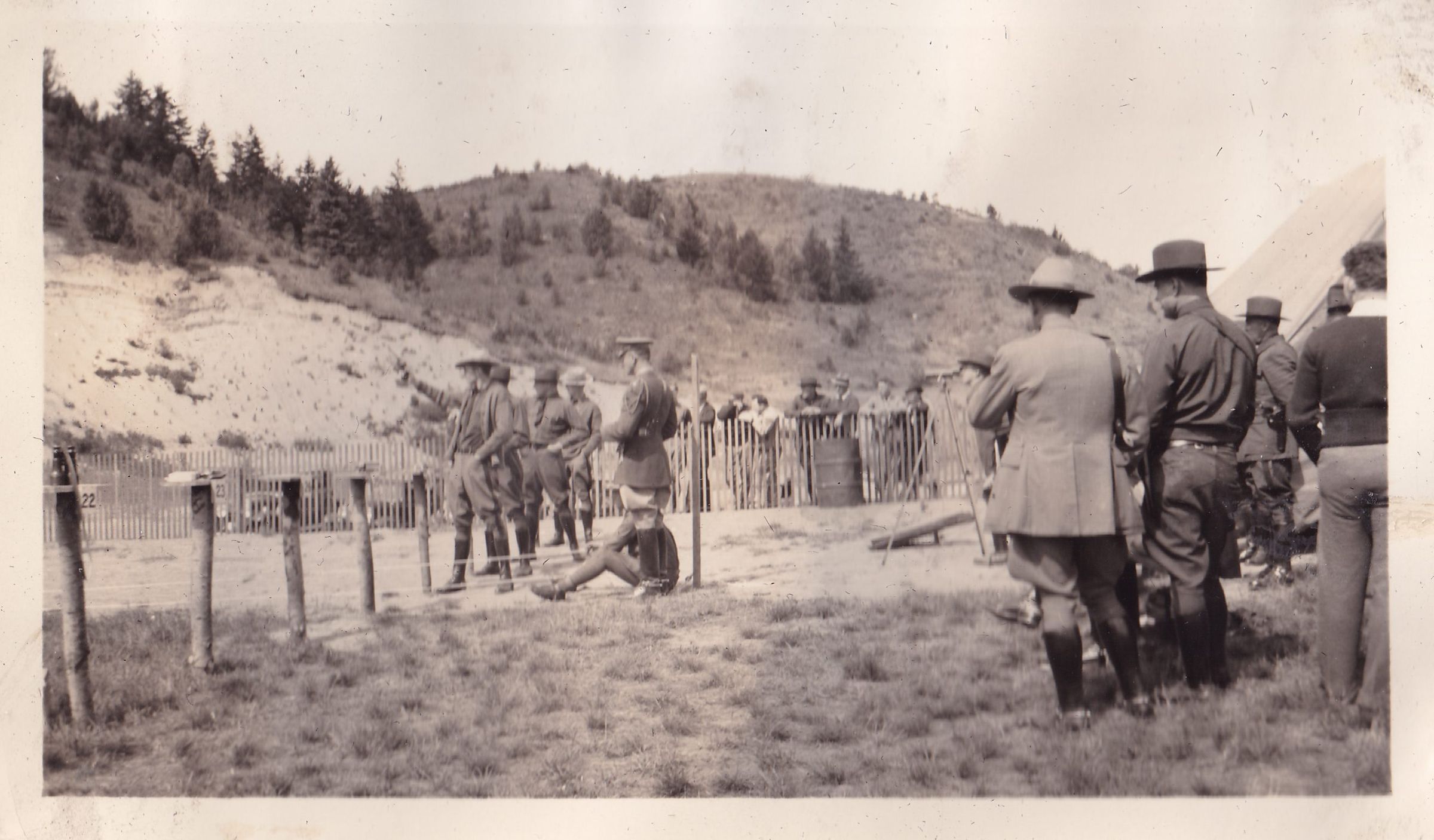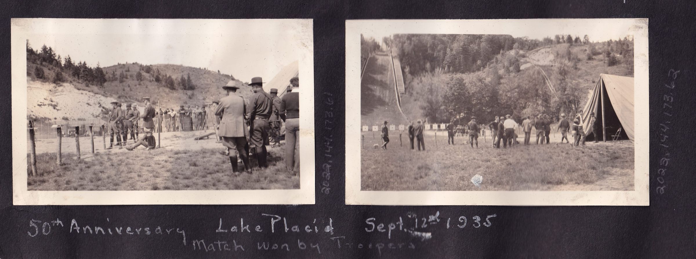 Photograph of a group of men in uniform lined up to shoot pistols. Spectators can be seen along a fence behind them. Handwritten caption on page reads, "Pistol Match between Game Protector and Troopers. 50th Anniversary, Lake Placid, September 12th, 1935. Match won by Troopers."Made/Created