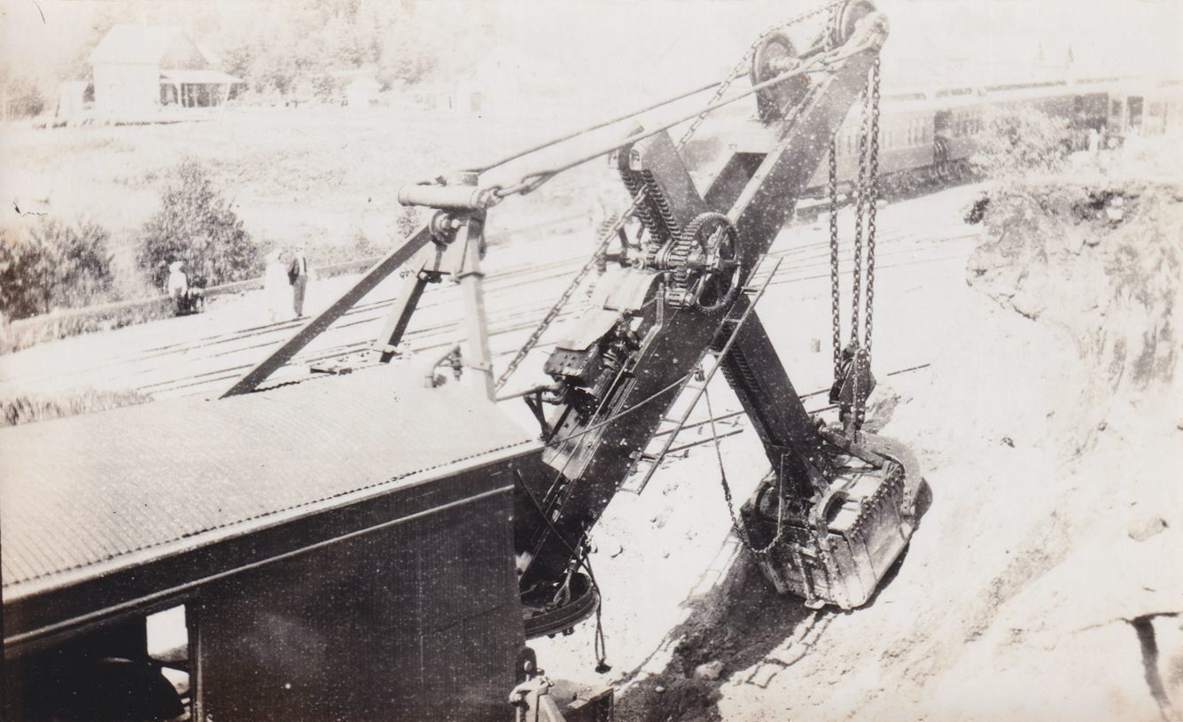 Black-and-White photograph of a steam excavator digging in a hillside along railroad tracks. Several people can be standing on the tracks watching. Photograph was likely printed by Kollecker's Kodak and Gift Shop.