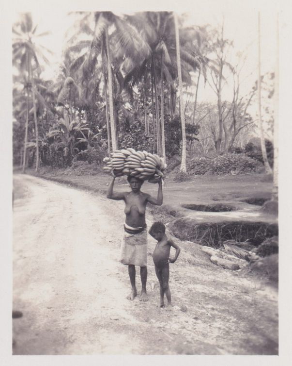 Black-and-White photograph of a woman with a bunch of bananas balanced on her head. She is topless. There is a nude child standing next to her, and palm trees can be seen behind them. The photograph was likely taken by a person on vacation in and printed by Kollecker's Kodak and Gift Shop.