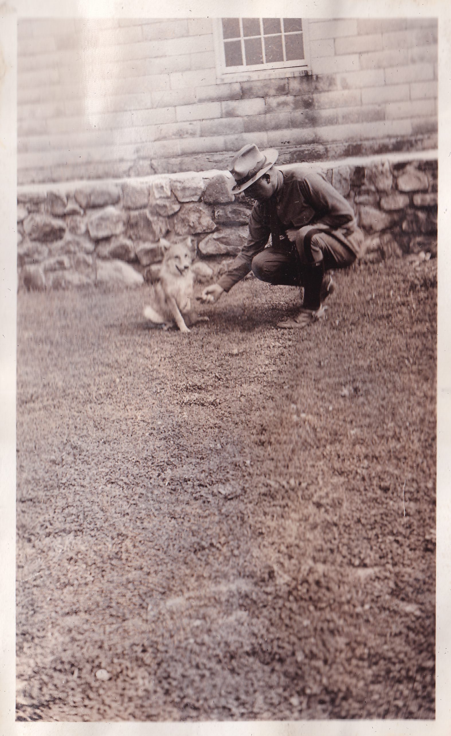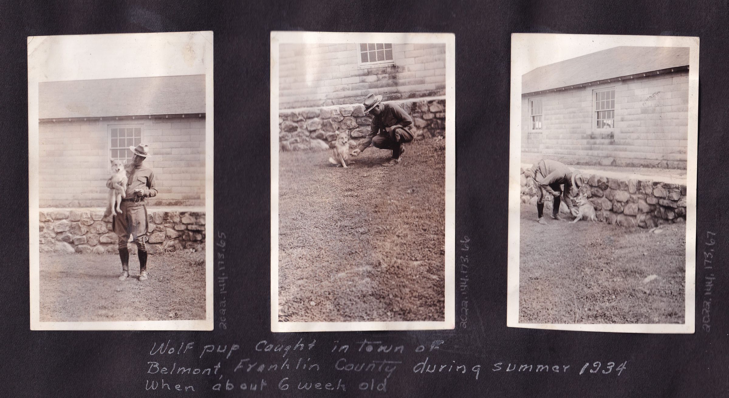 Photograph of a man in uniform squatting down next to a wolf pup. Handwritten caption on page reads, "Wolf pup caught in town of Belmonth, Franklin County during summer 1934 when about 6 week old."