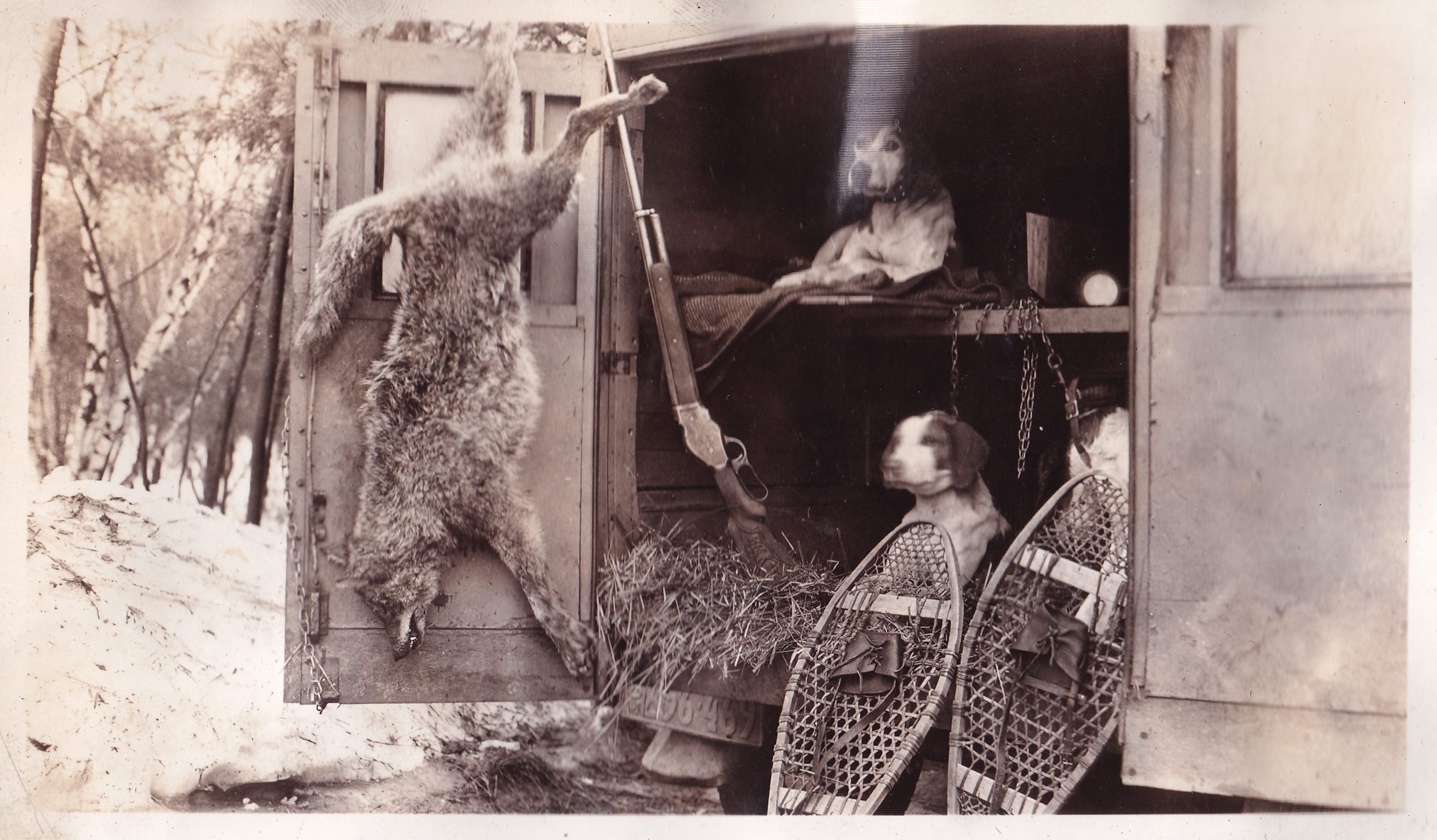 Photograph of a dead wolf hanging by its hind leg from the back door of a van. There are three hunting dogs seated in the back of the van, and a pair of snowshoes leaning against the bumper. Handwritten caption on page reads, "Dog wolf killed by Fred Streever, Ballston Spa, near Saratoga Lake."Made/Created