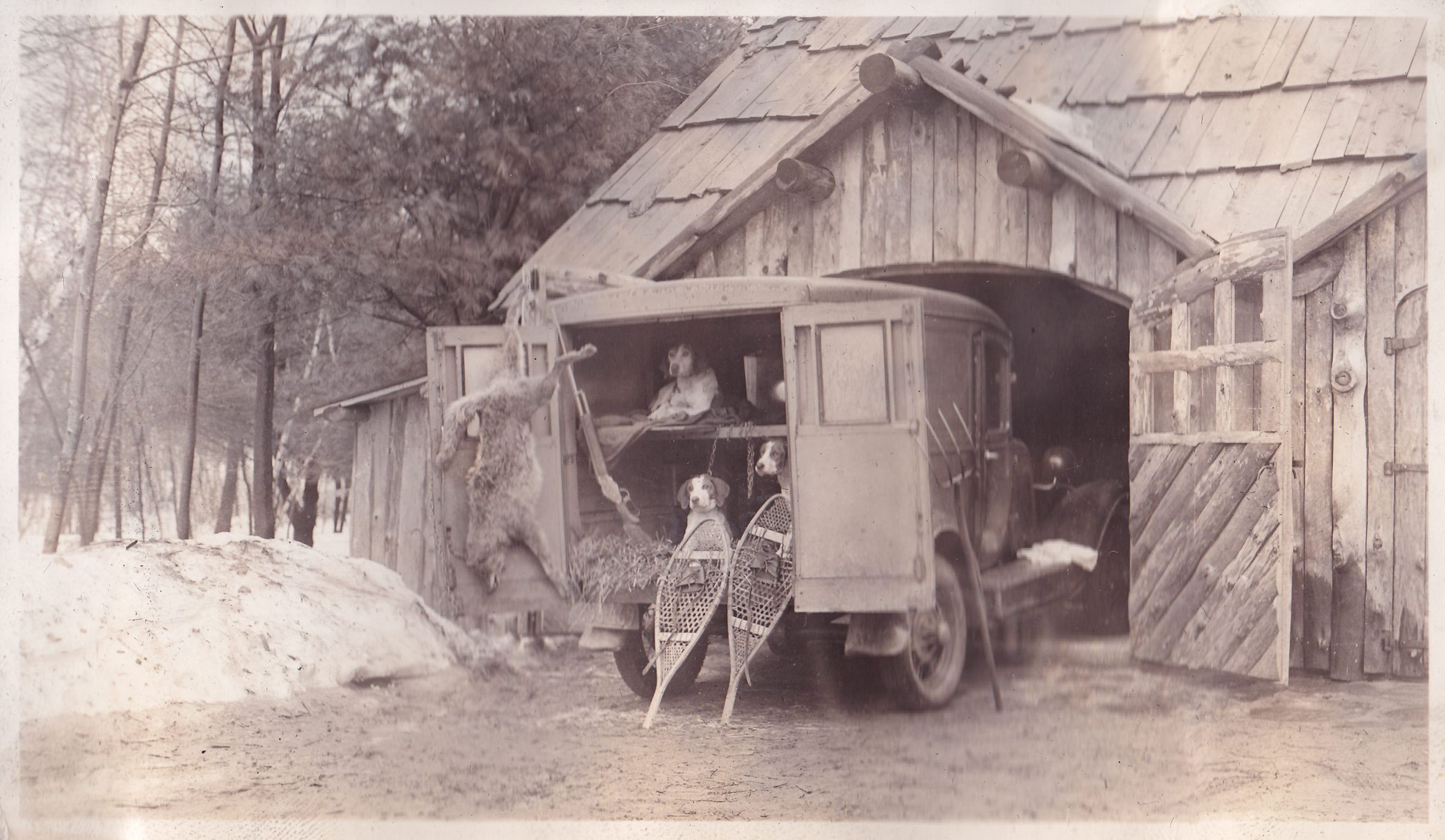 Photograph of a dead wolf hanging by its hind leg from the back door of a van. The van is parked partway in an open garage door. There are three hunting dogs seated in the back of the van, and a pair of snowshoes leaning against the bumper. Handwritten caption on page reads, "Dog wolf killed by Fred Streever, Ballston Spa, near Saratoga Lake."Made/Created