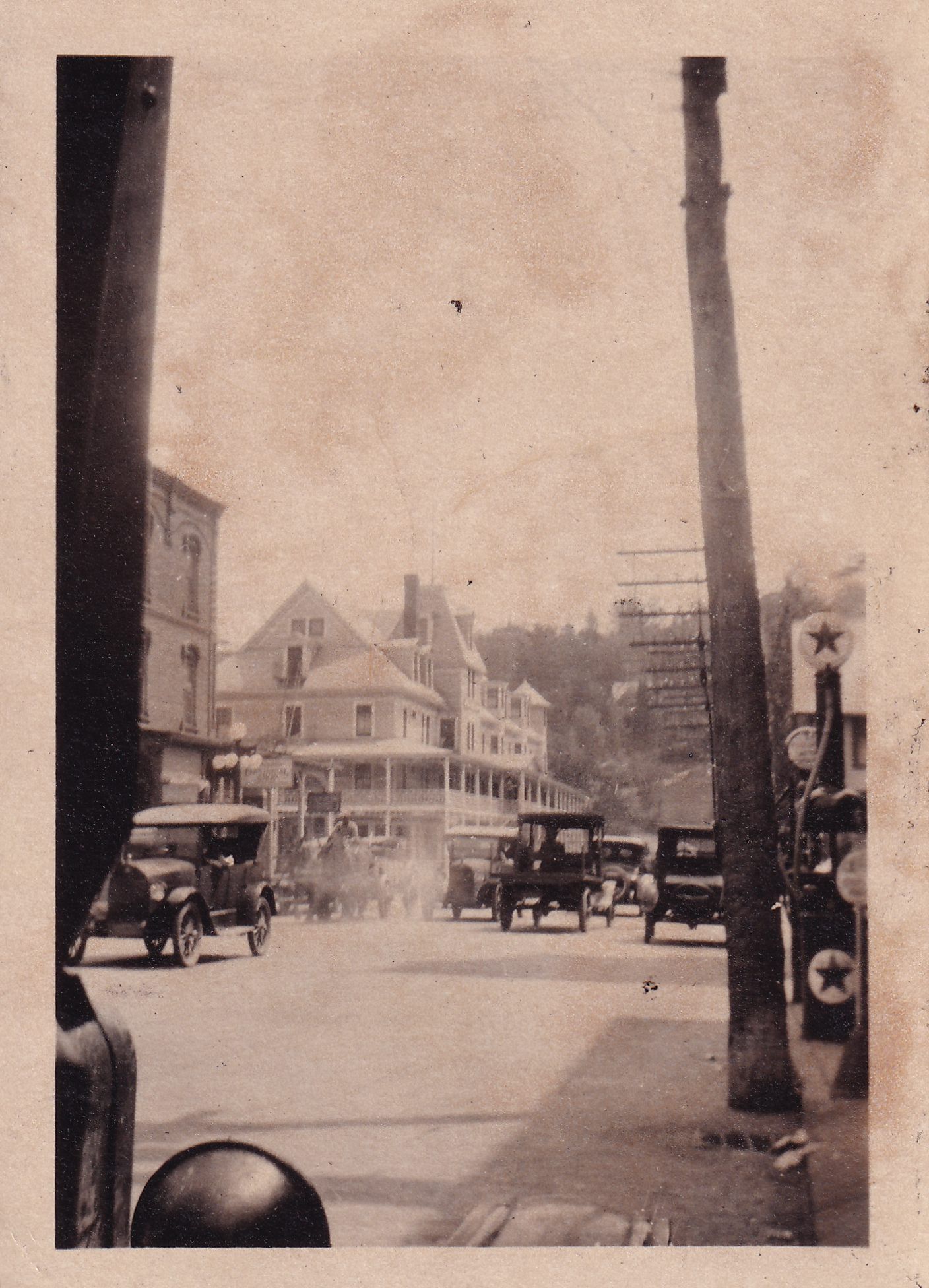 Photograph looking down Main Street toward the Riverside Inn and the intersection with River Street. The corner of the Spaulding Block is visible, along with the Riverside Inn. There is a gas pump visible on the right side of the street. Early style cars and a horse-drawn wagon are visible on the road.