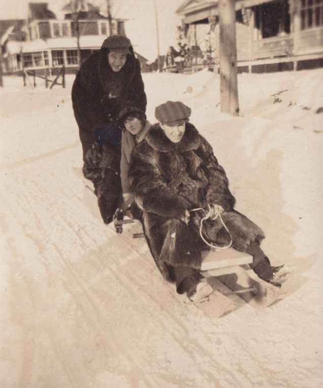Black-and-white photograph of three people sitting on a wooden toboggan with a man pushing them from behind. The toboggan is on Shepard Avenue and there are cure cottages in the background of the photograph.
