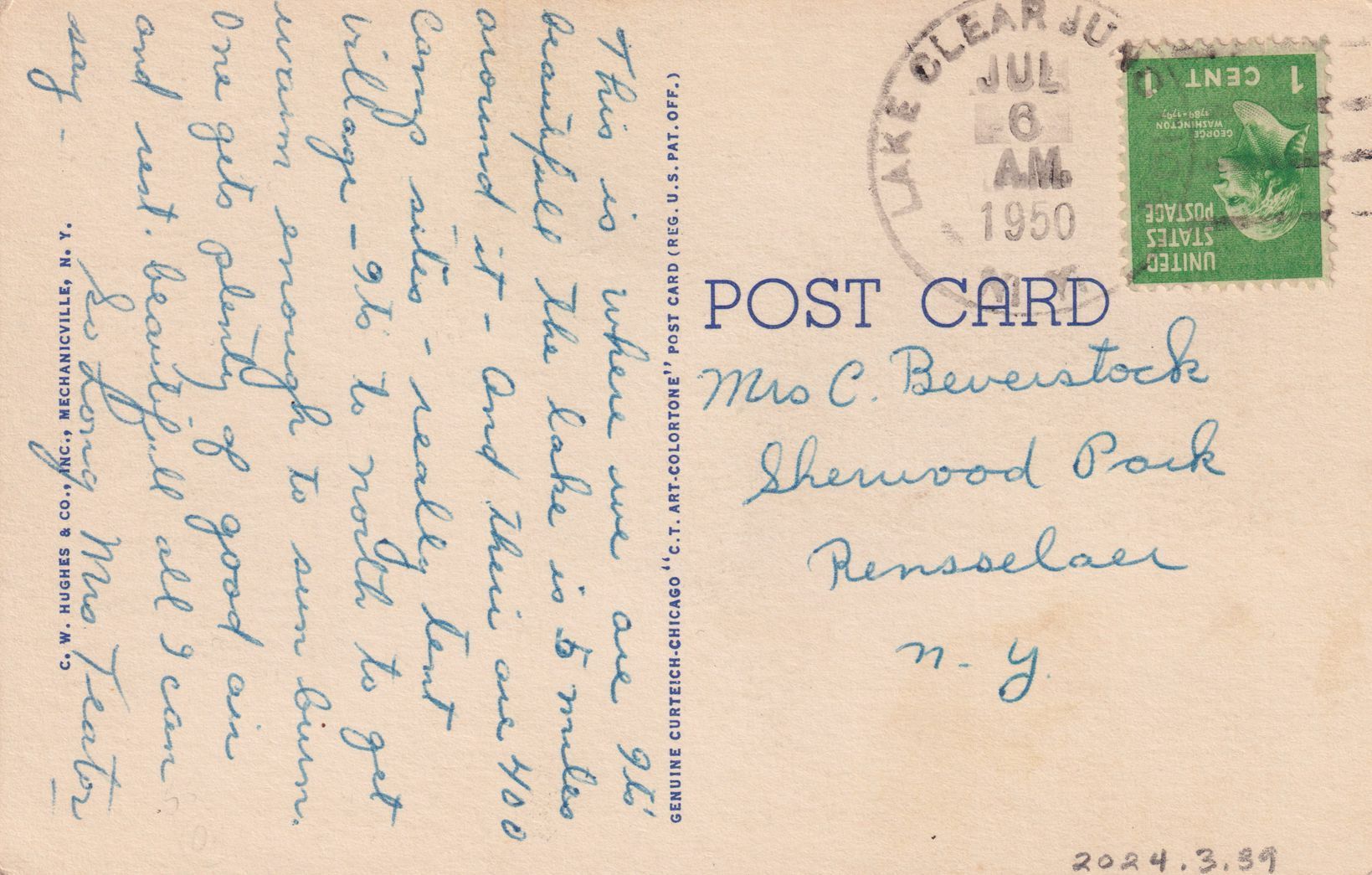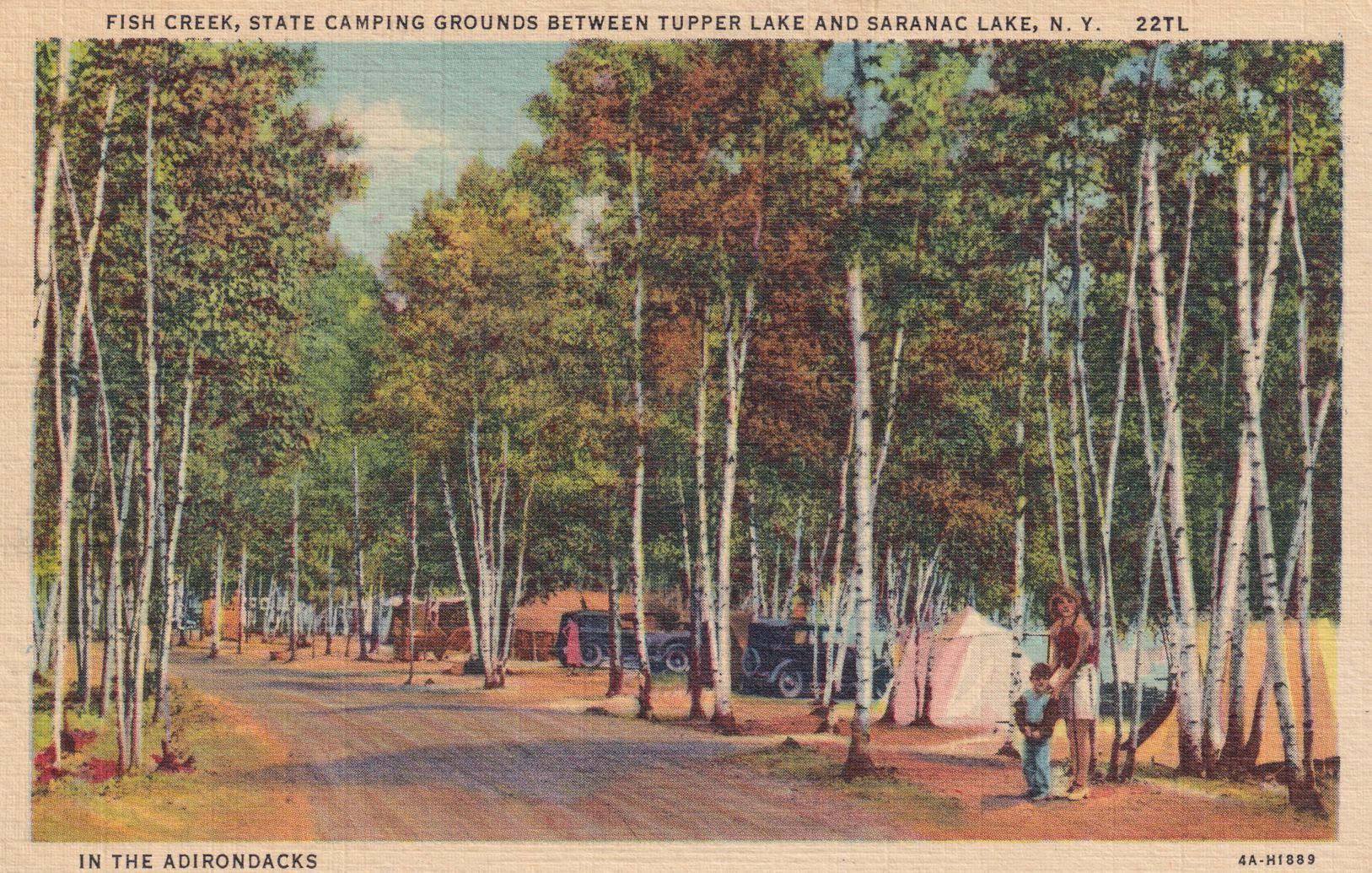 Color postcard showing a road lined with birch trees. There are tents and cars visible through the trees. Printed caption on front reads, "Fish Creek, State Camping Grounds Between Tupper Lake and Saranac Lake, N.Y." Printed by C. W. Hughes & Co., Inc., Mechanicville, NY. Used, divided back, white border, postmarked Lake Clear Junction, NY, July 6, 1950. Handwritten message on back reads, "This is where we are it's beautiful the lake is 5 miles around it. And there are 400 camp sites. Really tent village. It's to [sic] north to get warm enough to sun burn. One gets plenty of good air and rest. Beautiful all I can say. So long Mrs. Teator." Mailed to Mrs. C. Beverstock, Sherwood Park, Rensselaer, NY.Subject Place