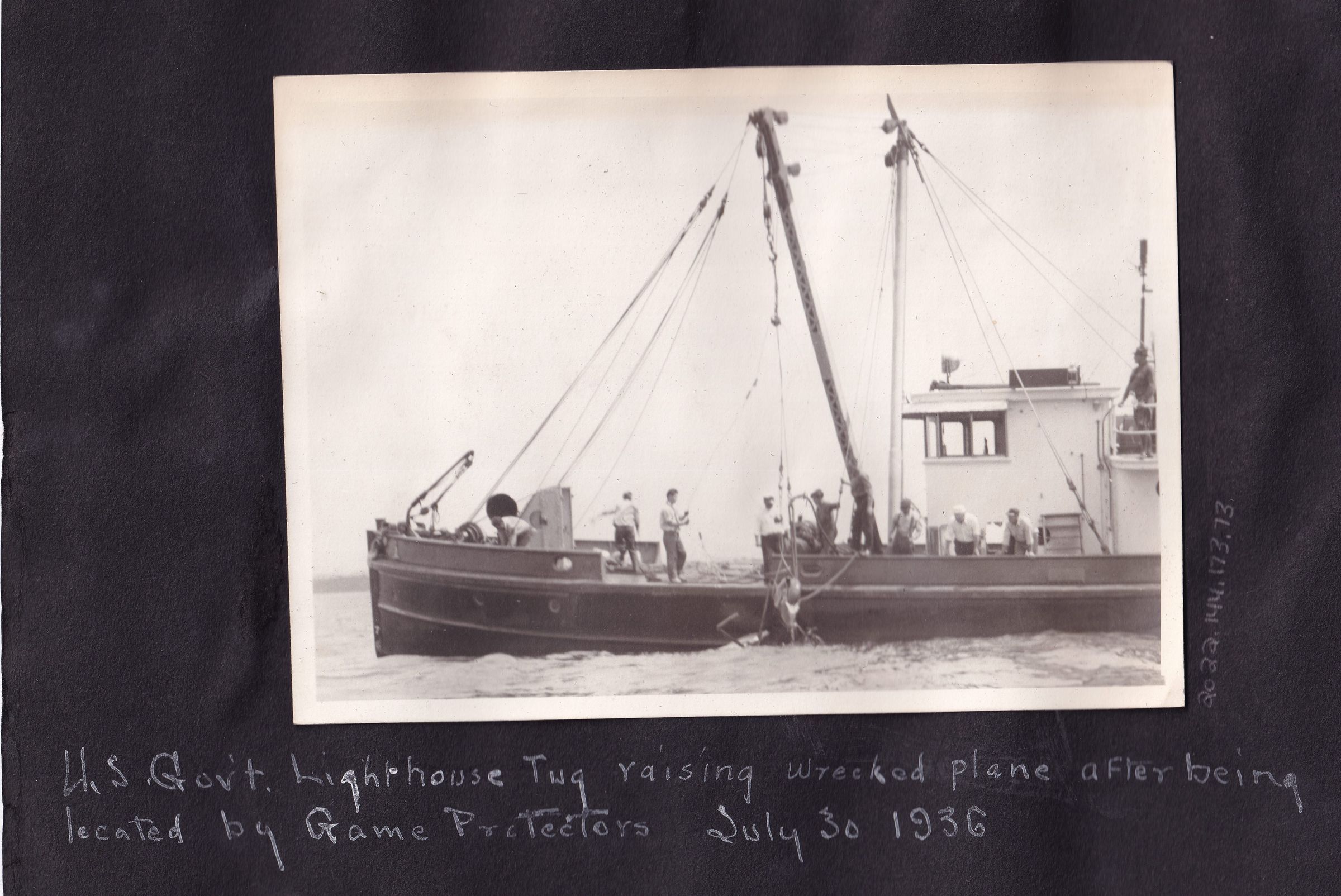 Photograph of a crew using a winch to raise the wreck of a plane onto a tugboat. Handwritten caption on page reads, "U. S. Gov't. Lighthouse Tug raising wrecked plane after being located by Game Protectors. July 30, 1936."