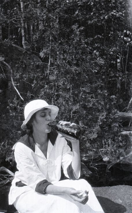 Negative of an unidentified woman sitting on a rock in front of a forest sipping out of a glass bottle, holding a piece of food in her other hand. She's wearing a light-colored outfit and hat. Most likely taken by Mary Ives Baldwin. This item is not fully cataloged but has been uploaded so the image is publicly available; if you would like us to prioritize cataloging this item, please contact the HSL Collections team.