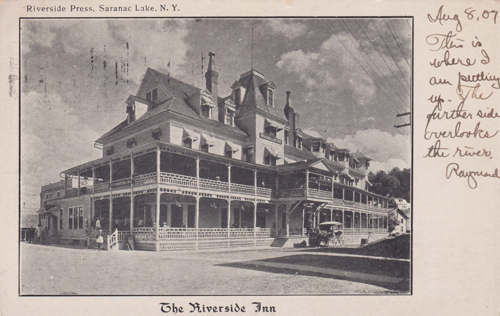 Black-and-White postcard showing the Riverside Inn on the corner of River and Main Streets. Printed caption on front reads, "the Riverside Inn." Published by the Riverside Press, Saranac Lake, NY. Used, undivided back, white border and box for message on front, postmarked Saranac Lake, August 9, 1907. Handwritten message on front reads, "Aug 8, 07. This is where I am putting up. The further side overlooks the river. Raymond." Mailed to Miss Ethel M. Stilson, 2559 Cedar Ave., Cleveland, Ohio.Subject Place