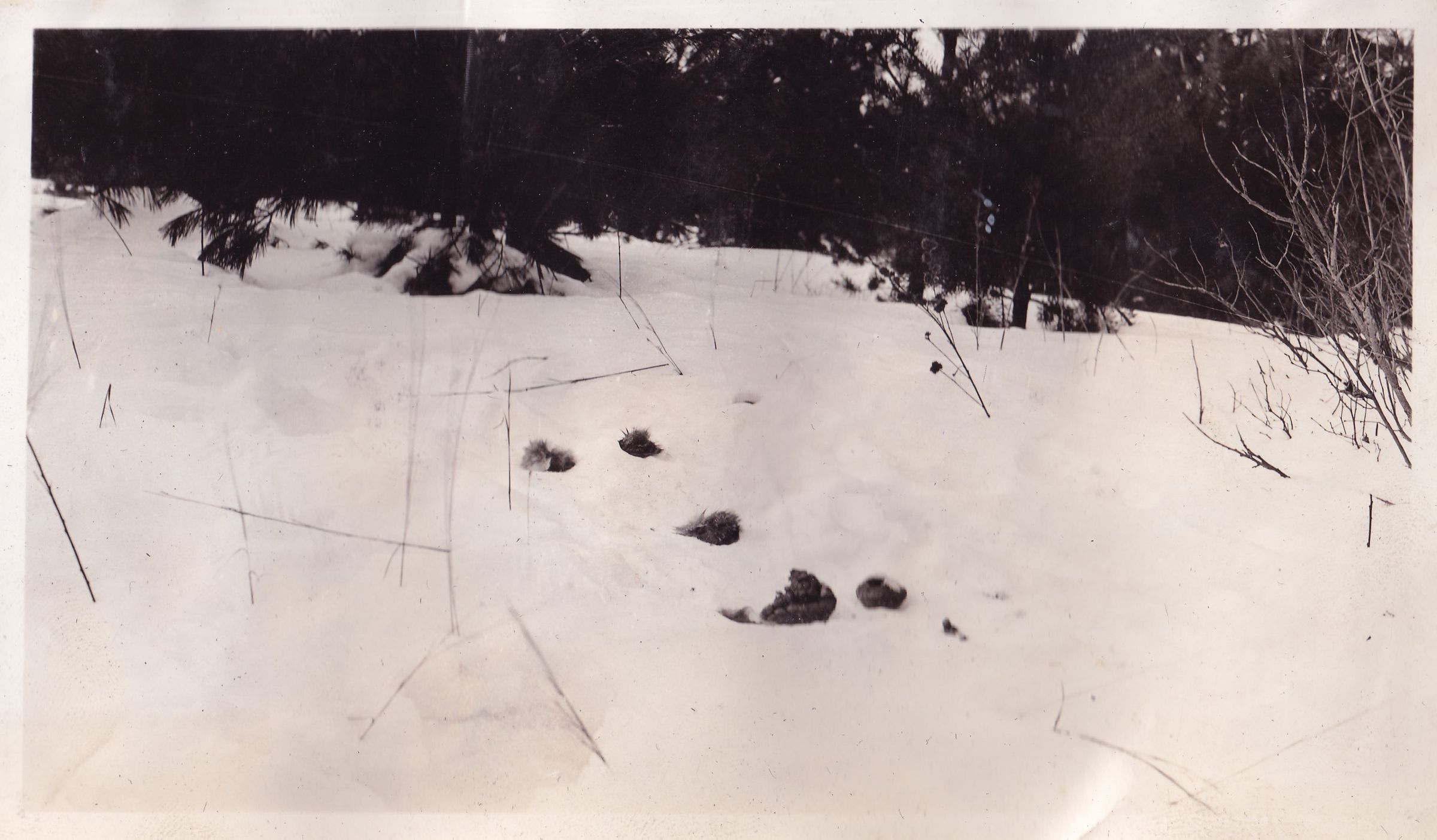 Photograph of wolf scat and tracks in the snow. Handwritten caption on page reads, "Wolf hunting by Fred Streever in vicitnity of Saratoga, N. Y. Winter 1936."
