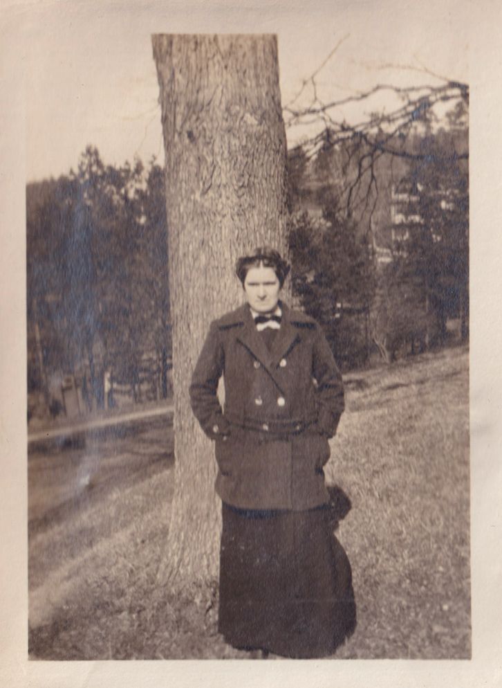 Black-and-white photograph of a woman standing outside in front of a tree. She is in a grassy area, though denser woods can be seen behind her.