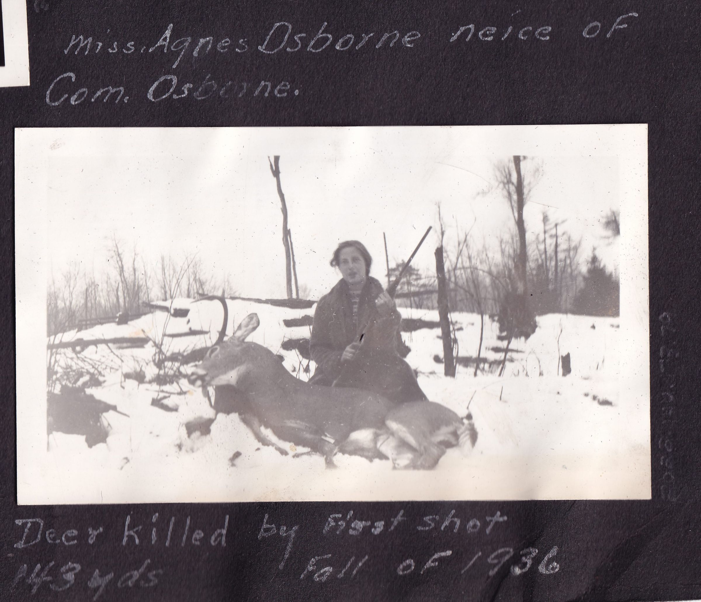 Photograph of a young woman sitting in the snow behind a dead deer. She is holding a rifle. Handwritten caption on page reads, "Miss Agnes Osborne, niece of Com. Osborne. Deer killed by first shot, 143 yds, Fall of 1936."Lexicon
