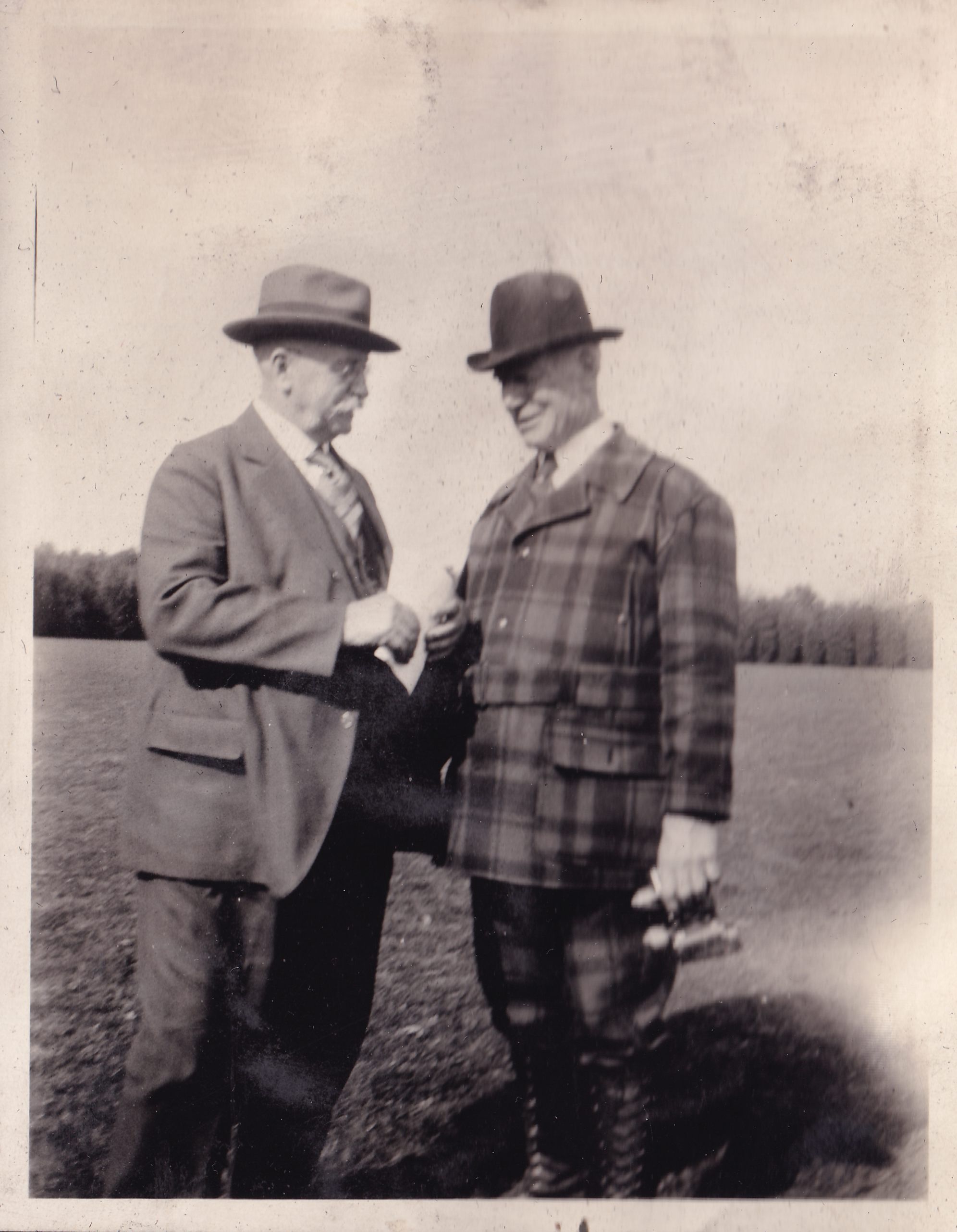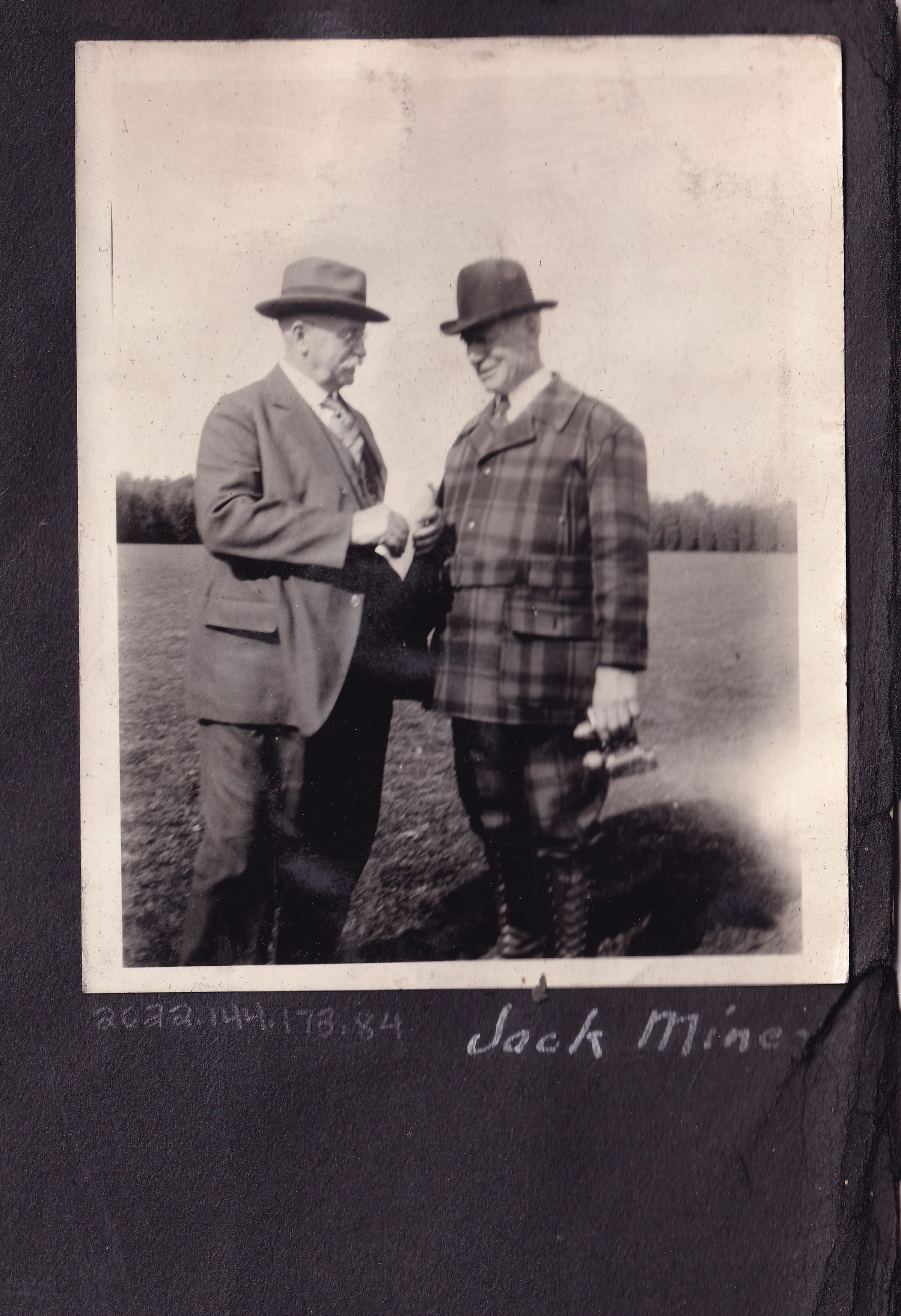 Photograph of two men standing in a field. The man at right is holding a pair of binoculars. Handwritten caption on page reads, "Jack Miner."
