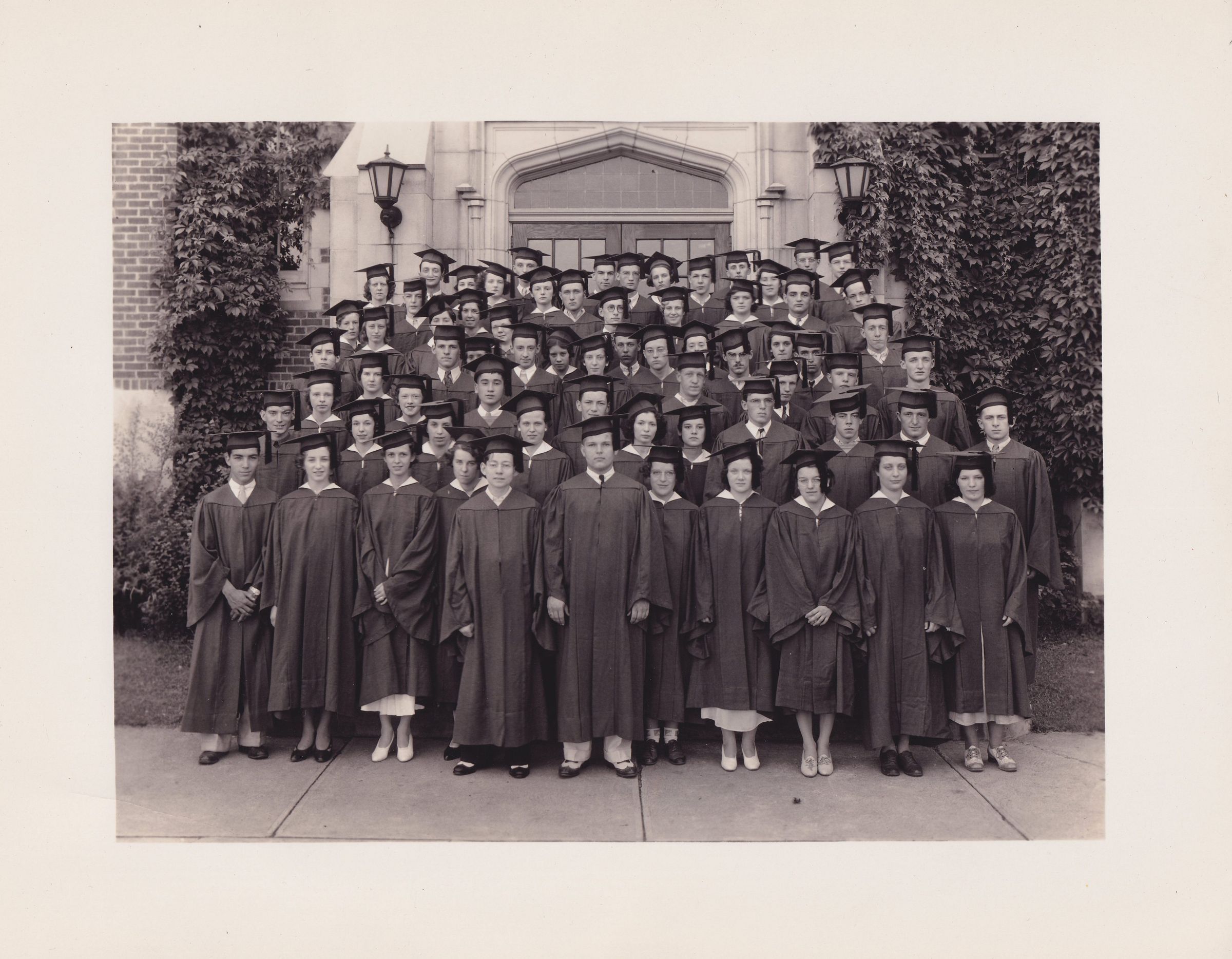 Photograph of the 1933 graduating class of Saranac Lake High School. The students are wearing caps and robes, standing on the front steps of Petrova School. Thomas Cantwell, who was class president, is standing at the center of the front row, wearing a dark tie and wingtip shoes under his graduation gown. Reverse is stamped, "Photos from W. F. Kollecker, Kodaks, Stationery, &c., 73 Main St., Saranac Lake, N. Y."
